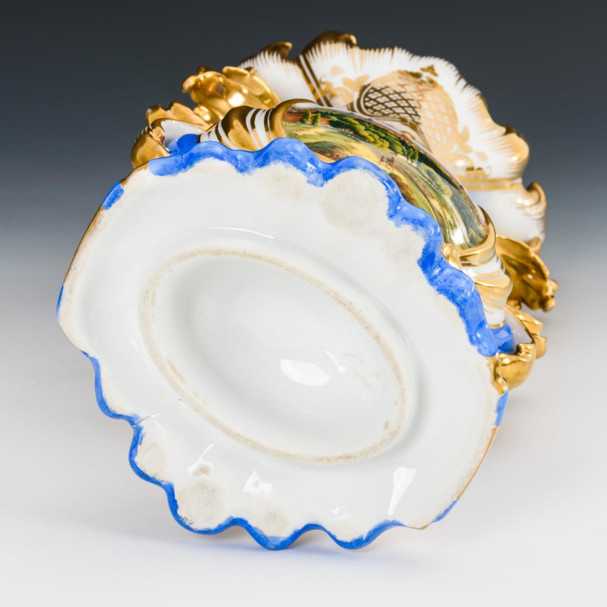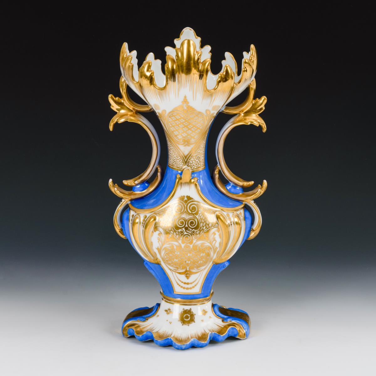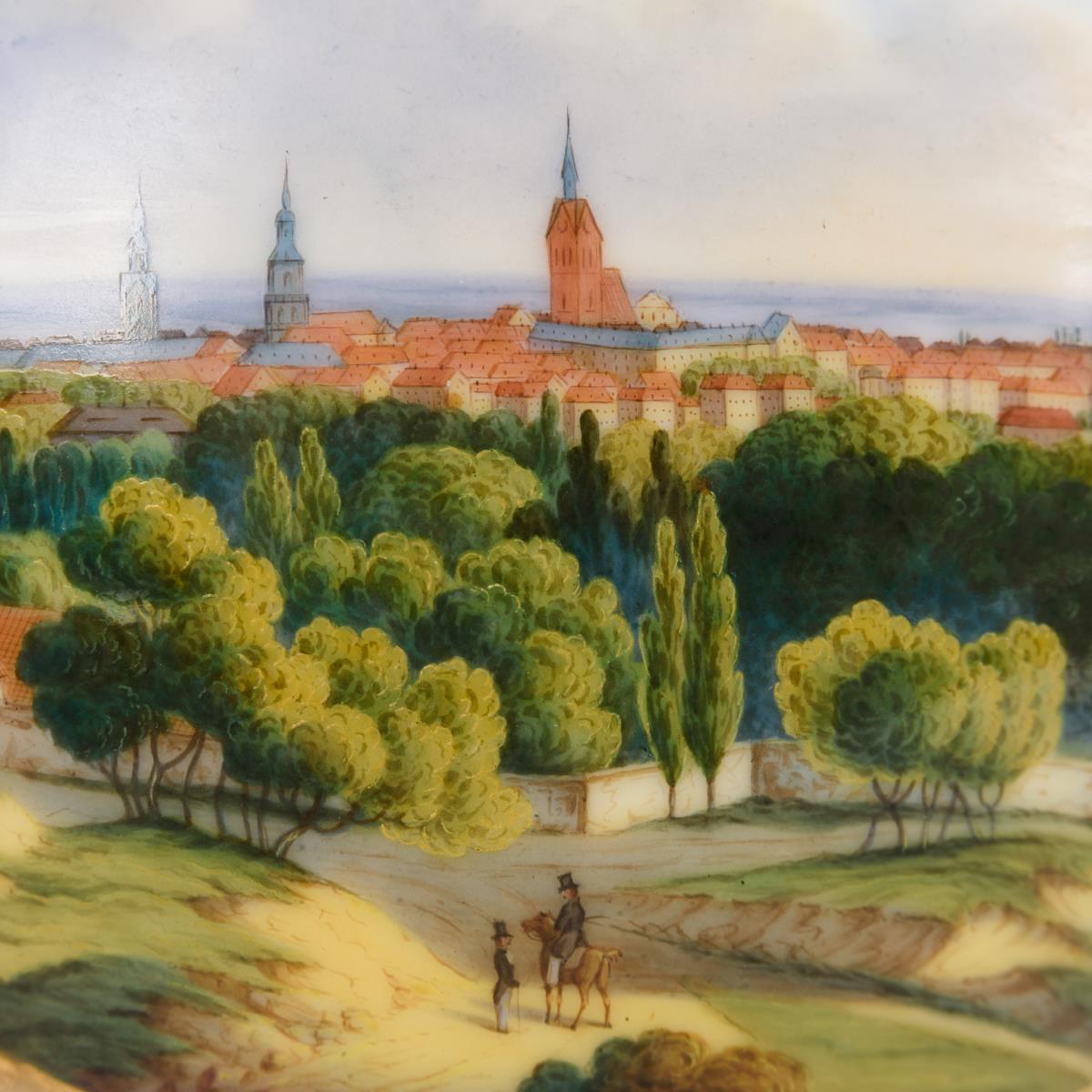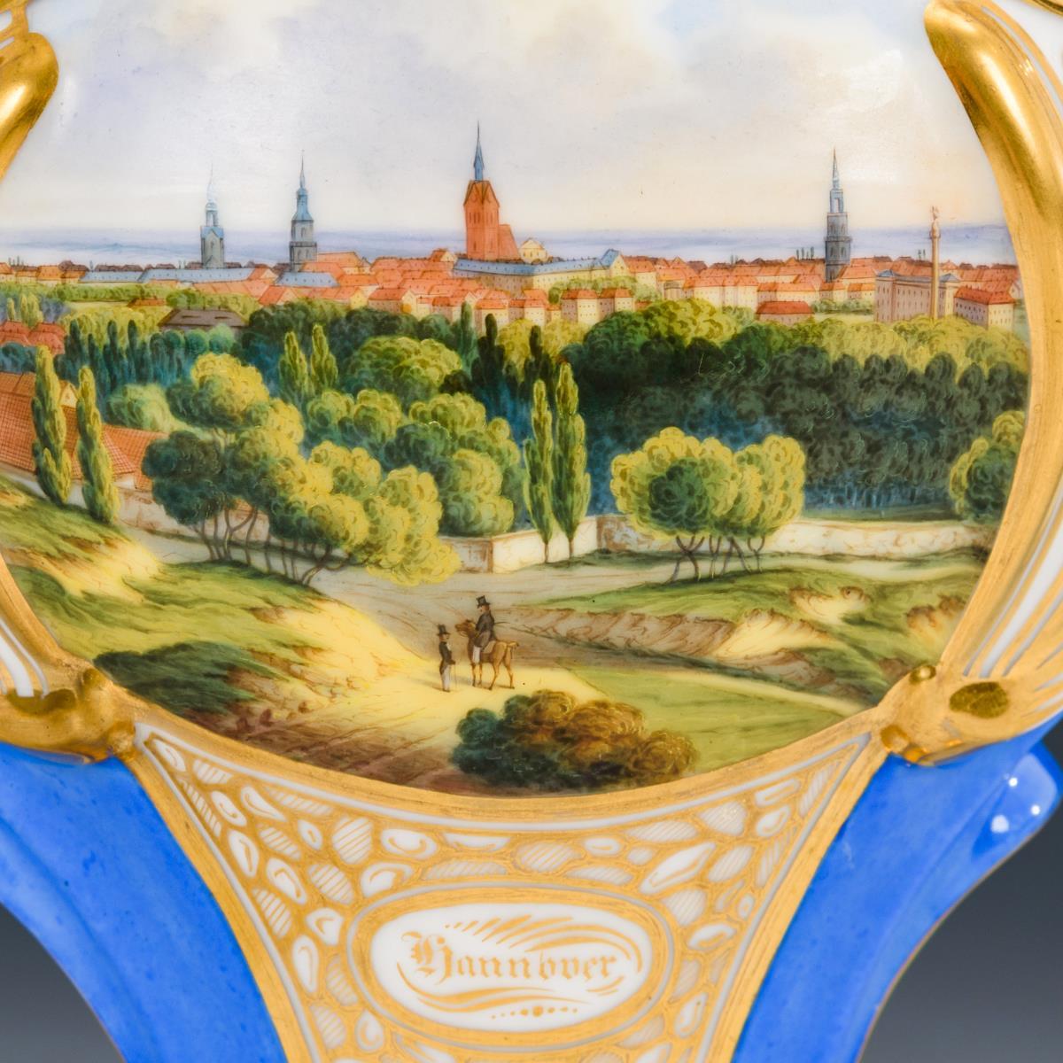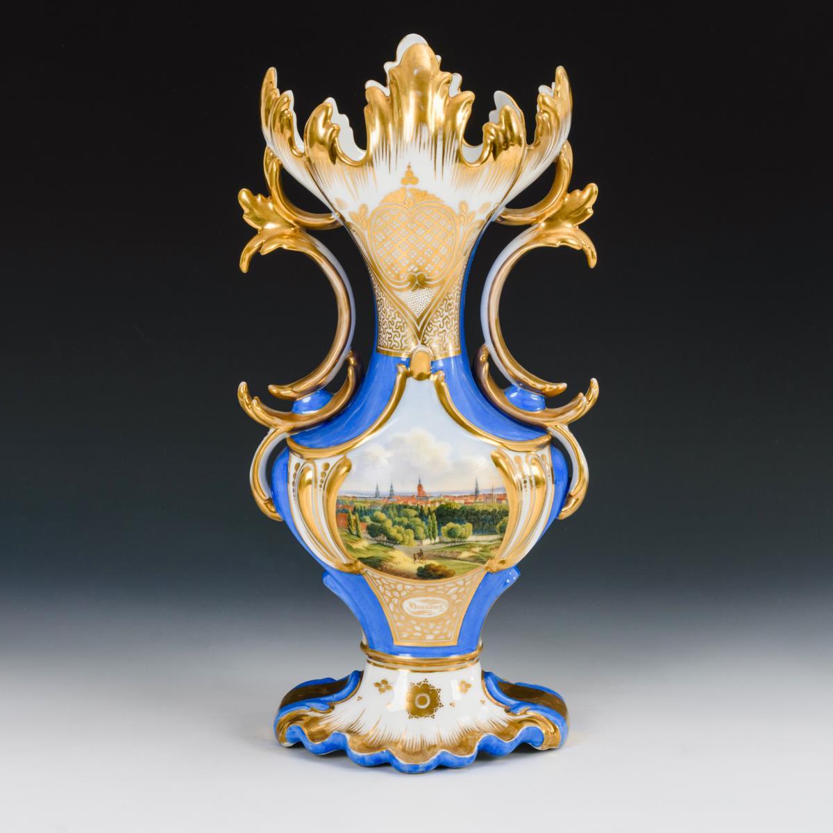 Gedrungene Balustervase mit schlankem Hals, weit geöffneter Mündung in Form von Blättern, zwei Henkeln und gemuscheltem Fuß. Blauer Fond, schauseitig die bezeichnete Ansicht der Stadt Hannover, verso ornamentale Goldmalerei. Partieller Goldabrieb, verso Brandriss am Fuß.