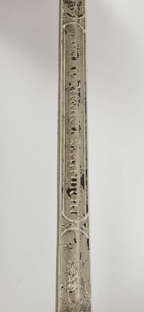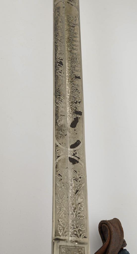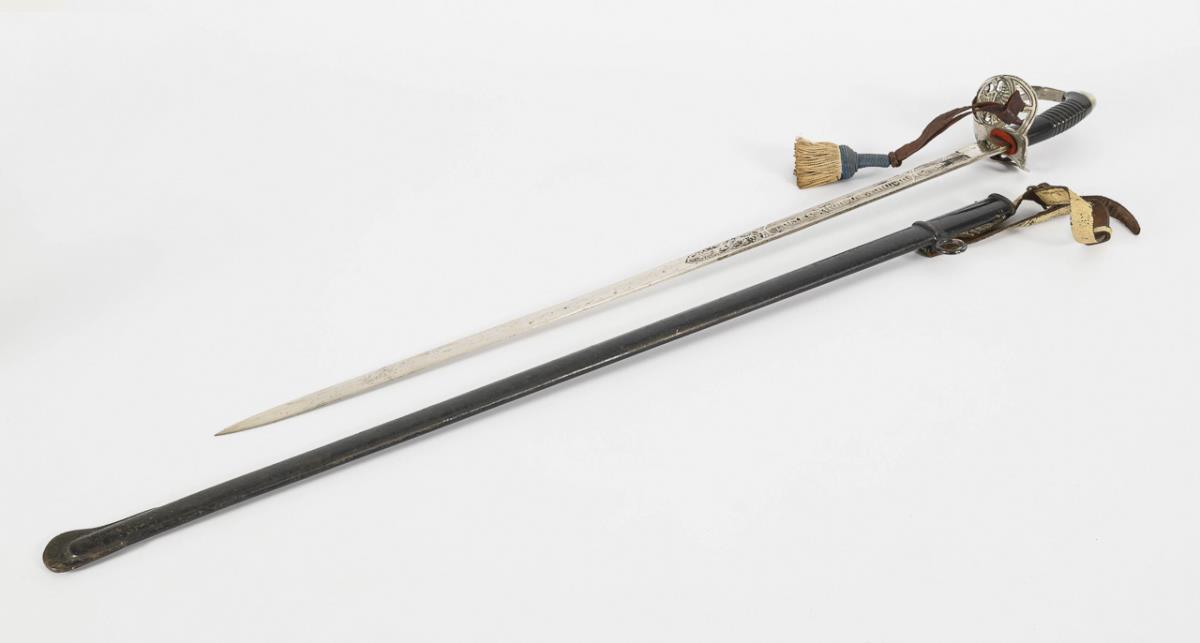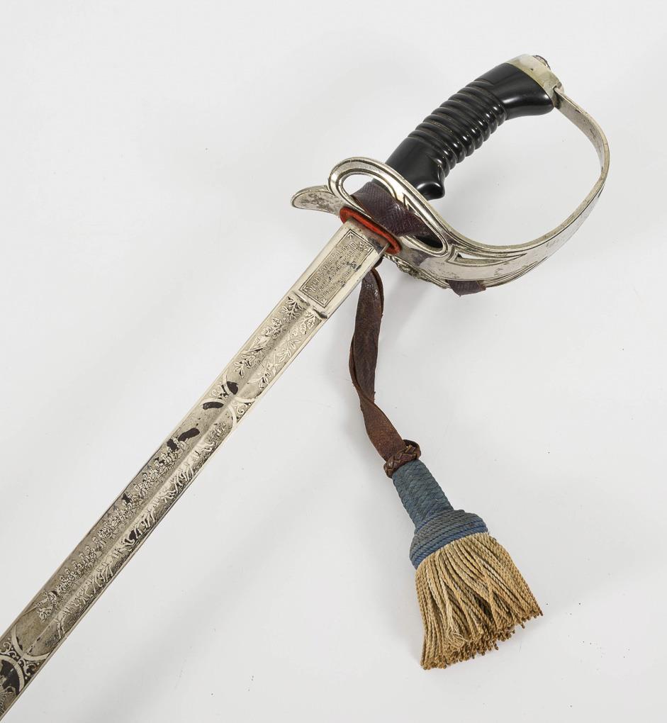 Gerade, einschneidige Klinge, gemarkt. Klinge mit geätztem Schriftzug, Gardestern und Truppendarstellung. Durchbrochen gearbeiteter Korb mit Adler, gerippter Kunststoffgriff und Portepee in Blau und Weiß. Schwarze Metallscheide mit einem Ring und weißem Lederriemen. Altersspuren, Klinge und Scheide fleckig, weißer Lederriemen stärker berieben.