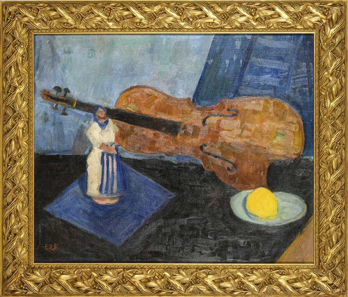 Das Instrument neben einem Teller mit Zitrone und einer Figur.