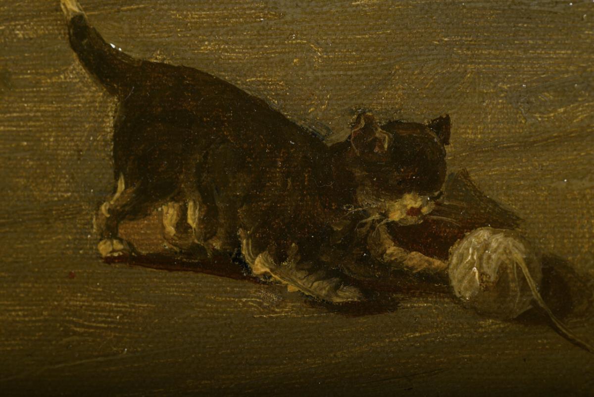 Freudig auf das spielende Kätzchen blickende alte Frau mit dem Strickzeug, auf einem Armlehnstuhl sitzend. Leichte Kratzer.