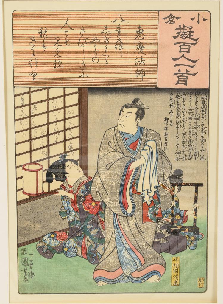 "Der Schauspieler Bandô hikosaburô mit Schwert", ca. 1840. / Gedichtsammlung der 100 Dichter des 7.-13. Jahrhundert, Blatt 47, Gedicht des Ekei Hoshi, 1843/45, Abzug der Zeit. Beide im Passepartout, mit Zuschreibungen.