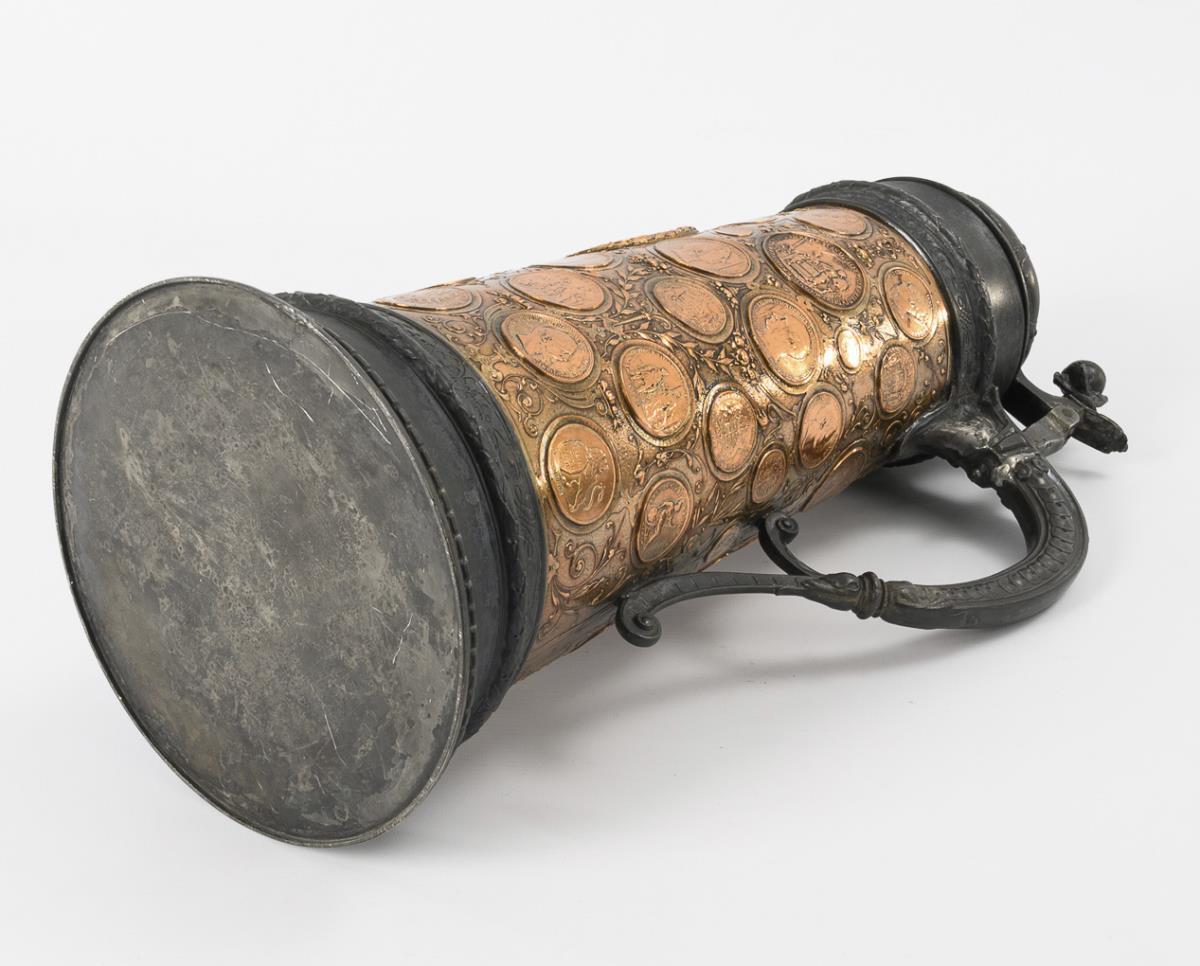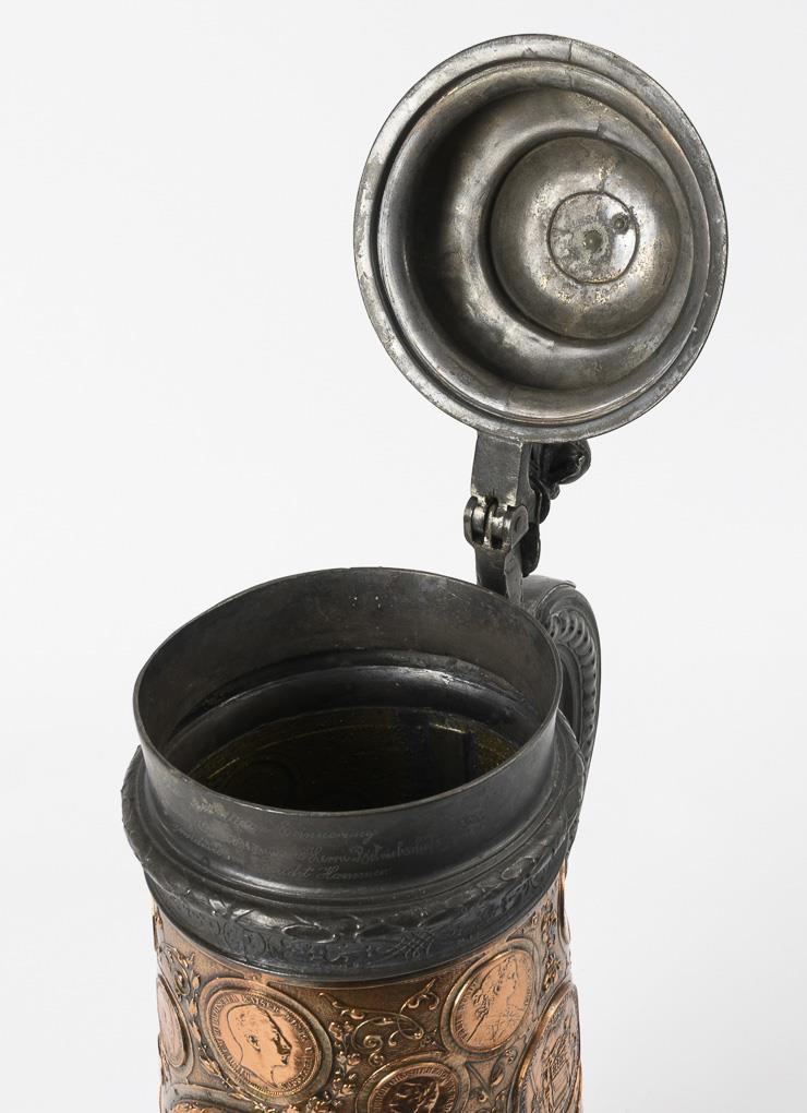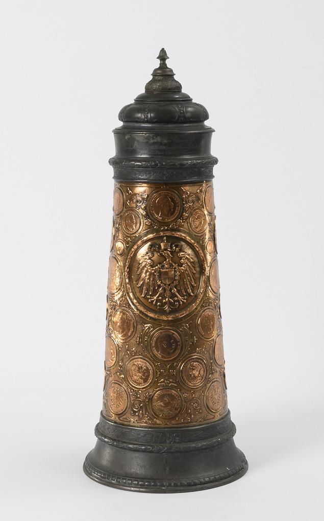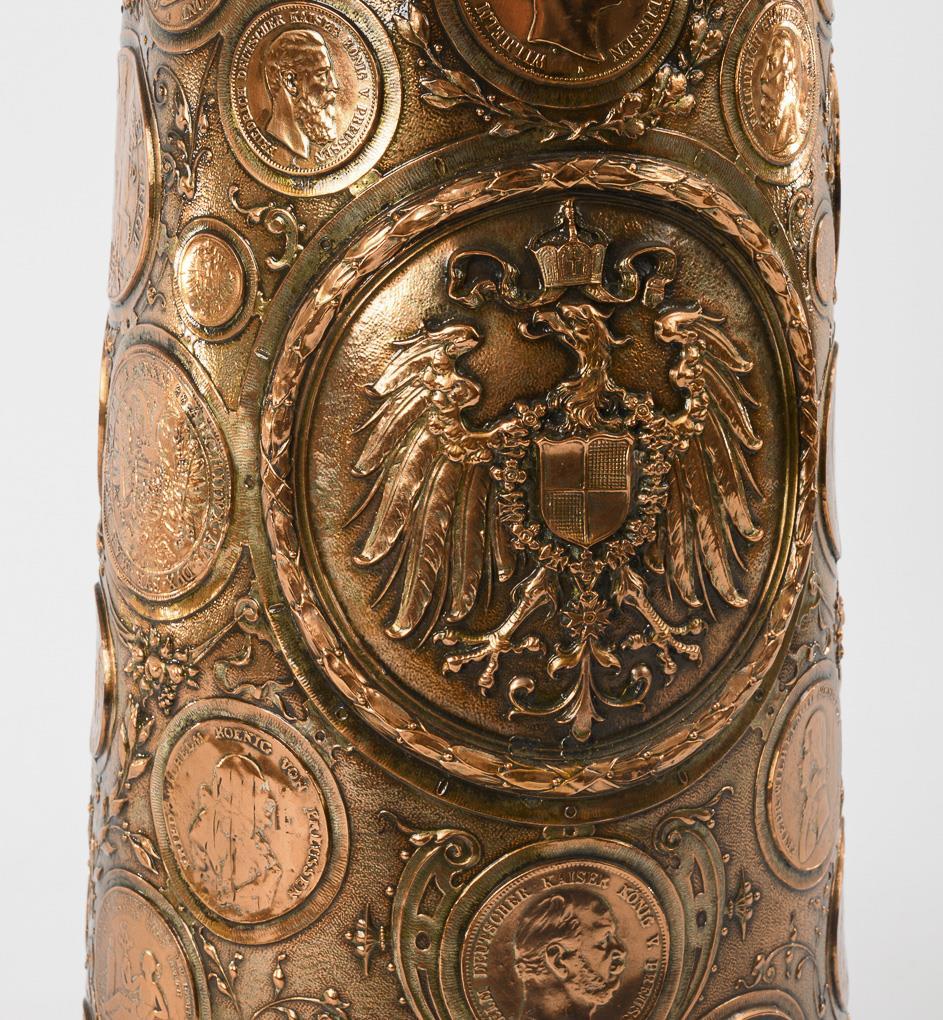 Gestufter Fuß teils ornamental reliefiert, Kupfer-Wandung allseits überaus zahlreich mit reliefierten Münz-Abbildungen versehen; in der Mitte im Lorbeerkranz der Reichsadler mit Hohenzollern-Wappen auf der Brust. Am Lippenrand gestichelte Widmung von 1891. Gestufter Scharnierdeckel mit dem Drücker in Form des Reichsapfels in einer Adlerklaue sowie reliefierter Henkel. Lötreparaturen an Fuß, Henkel und Drücker.