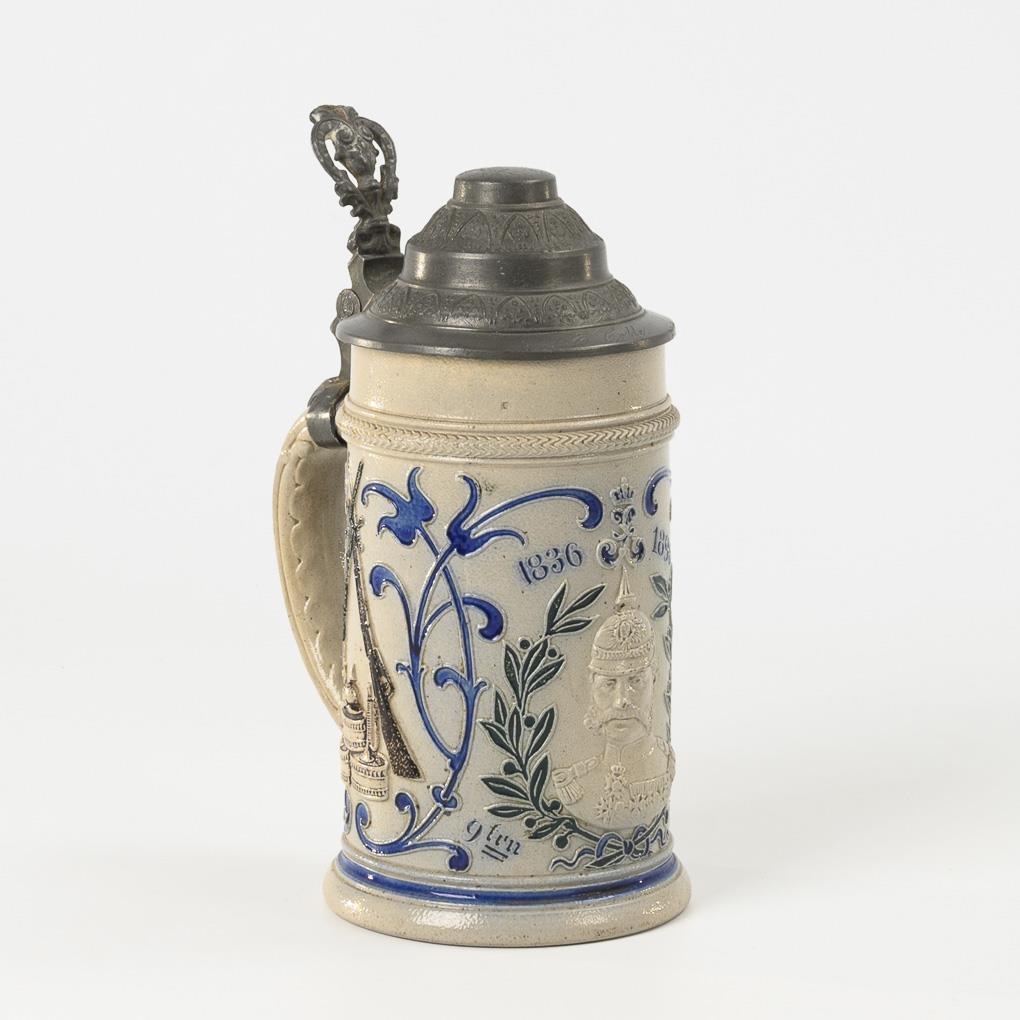 Halbliter-Reliefkrug mit dem Bildnis des Königs in Uniform unter bekröntem Spiegelmonogramm. Weiterhin militärische Symbole und Schriftzug 9. 6. 1836 - 1896. Reliefierter Zinndeckel mit Vasen-Drücker.
