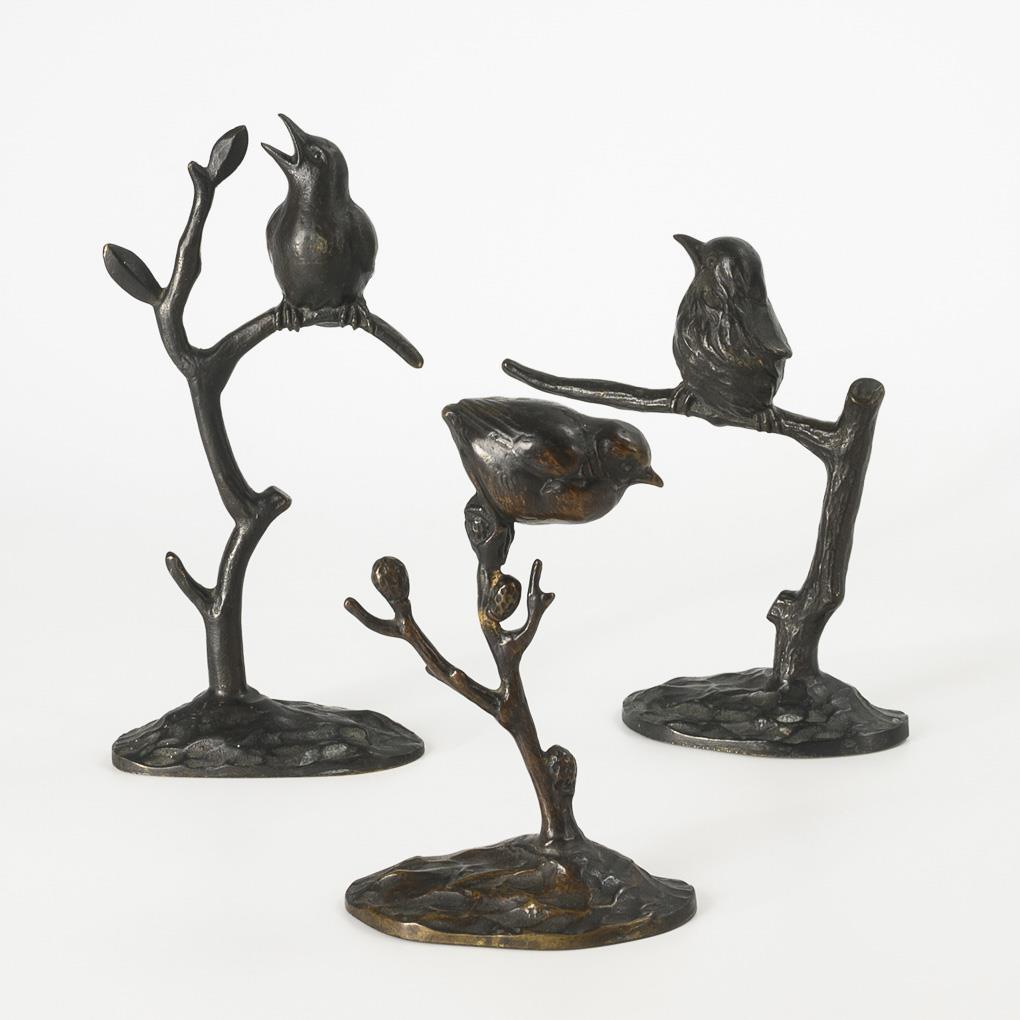 Je ein einzelner Vogel in unterschiedlicher Haltung auf einem Zweig sitzend. 1x Ast etwas verbogen, an dieser Figur auch einige Patinaschäden.