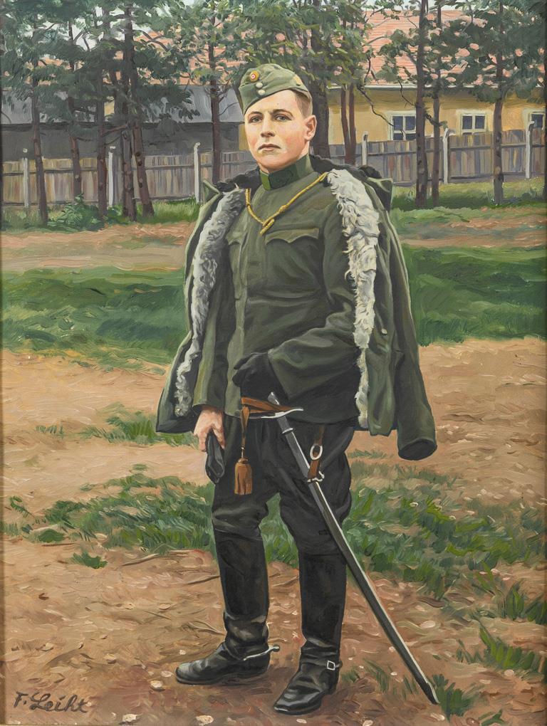 Junger Mann in grüner Uniform mit Degen auf einem umzäunten Gelände.