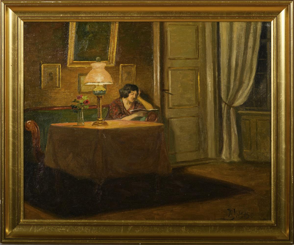 Junge Frau mit einem Buch bei abendlichem Lampenschein in der Stube. Leichte Altersspuren.