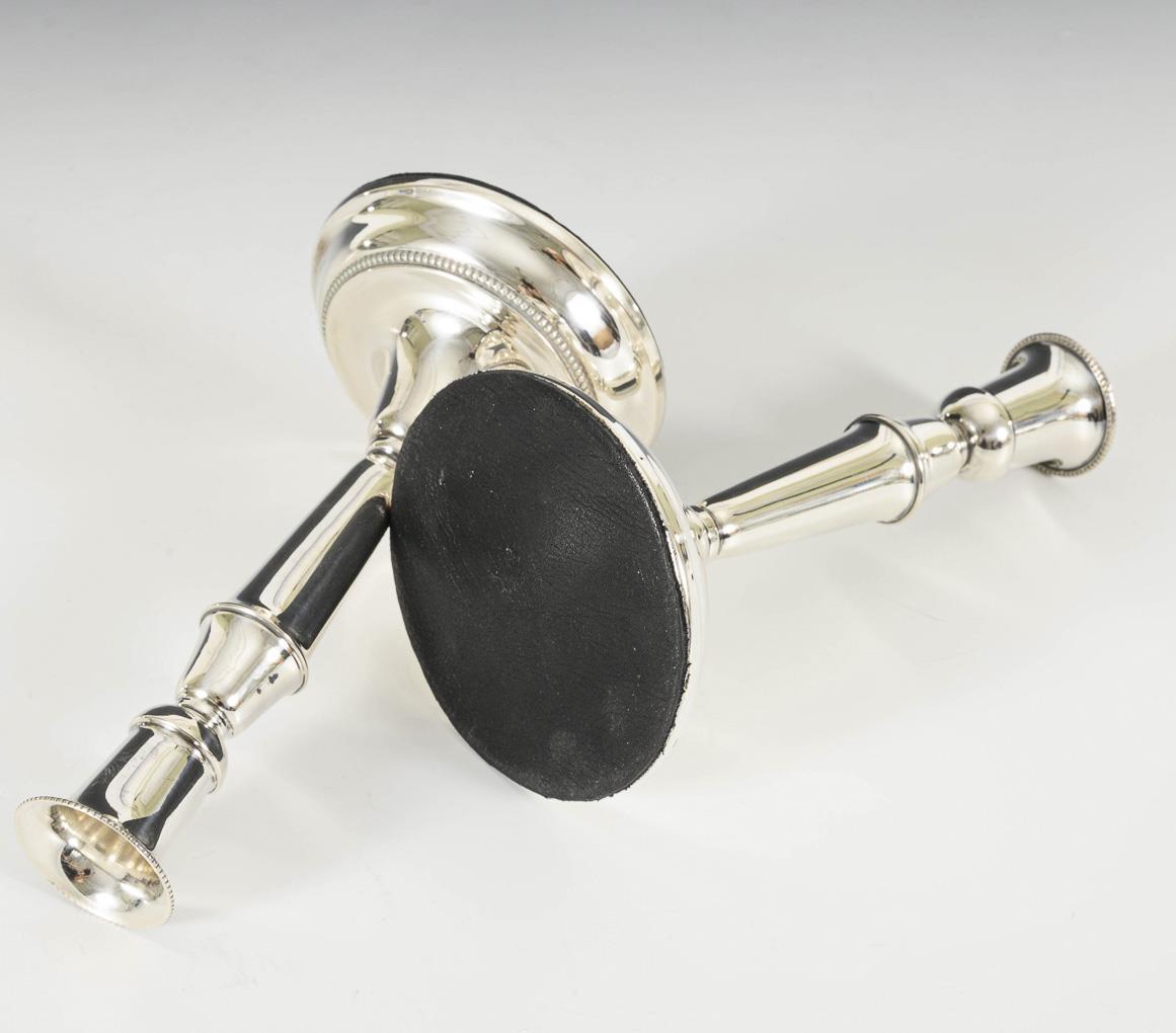 Schlichte, 1-flammige Leuchter mit zartem Perlrand an Tülle und Rundfuß. Minimale Gebrauchsspuren, unterseitiges Leder ergänzt.