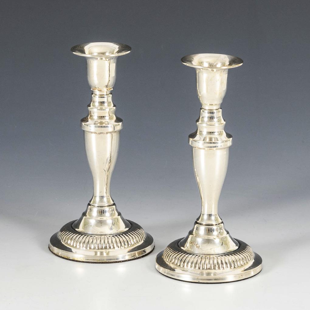 Schlichte, 1-flammige Leuchter in Balusterform, mit teilgeripptem Rundfuß. Beide Leuchter gedellt, unterseitiges Leder ergänzt.