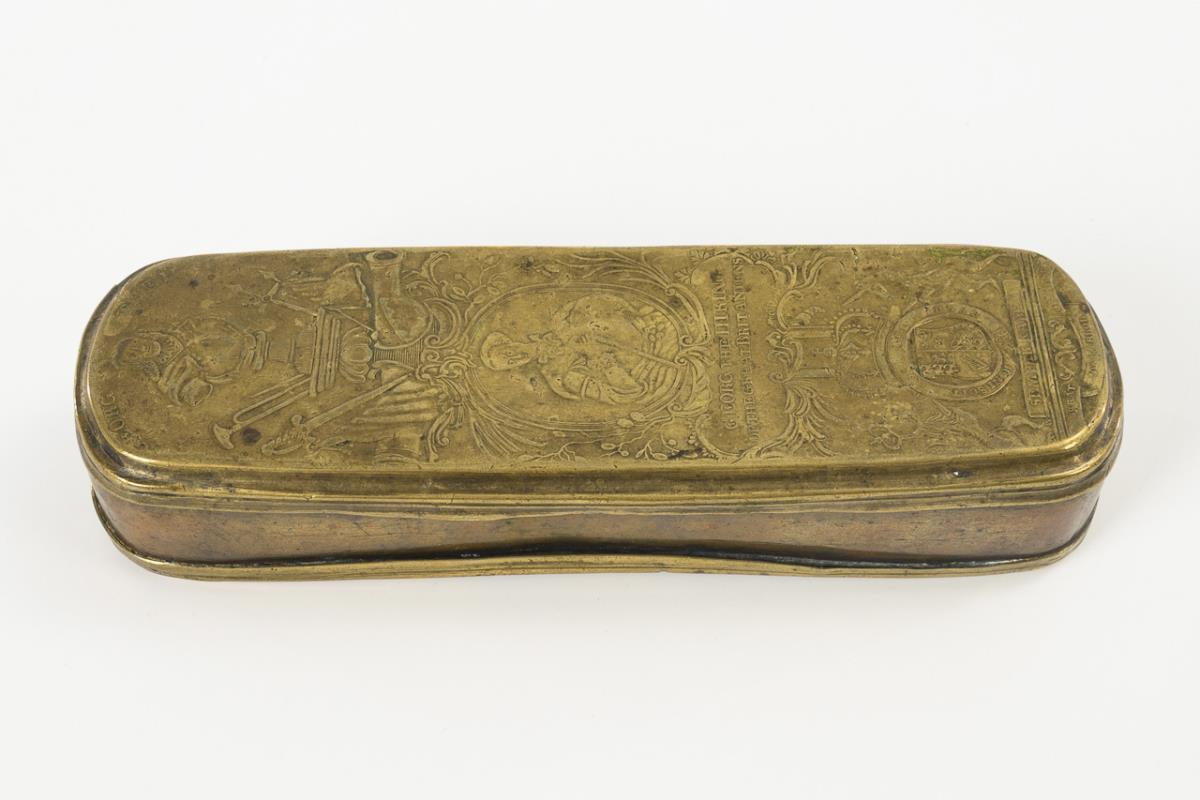 Oblonge Dose. Auf dem unsignierten Scharnierdeckel Bildnis von "Georg III., King of the Great Britanniens" mit seinem Wappen sowie Büste seines Großvaters Georg II. (Hersteller: Johann Heinrich Becker). Geprägter Boden mit den "Triumphi Fredericus Maximius" mit 12 Schlachtendarstellungen, darunter Mollwitz, Prag, Liegnitz, Torgau, Lobositz, Roßbach usw. (Hersteller Johann Heinrich Giese, mit Signaturrest). Verbeult und berieben, kleiner Haarriss am Deckelrand.
