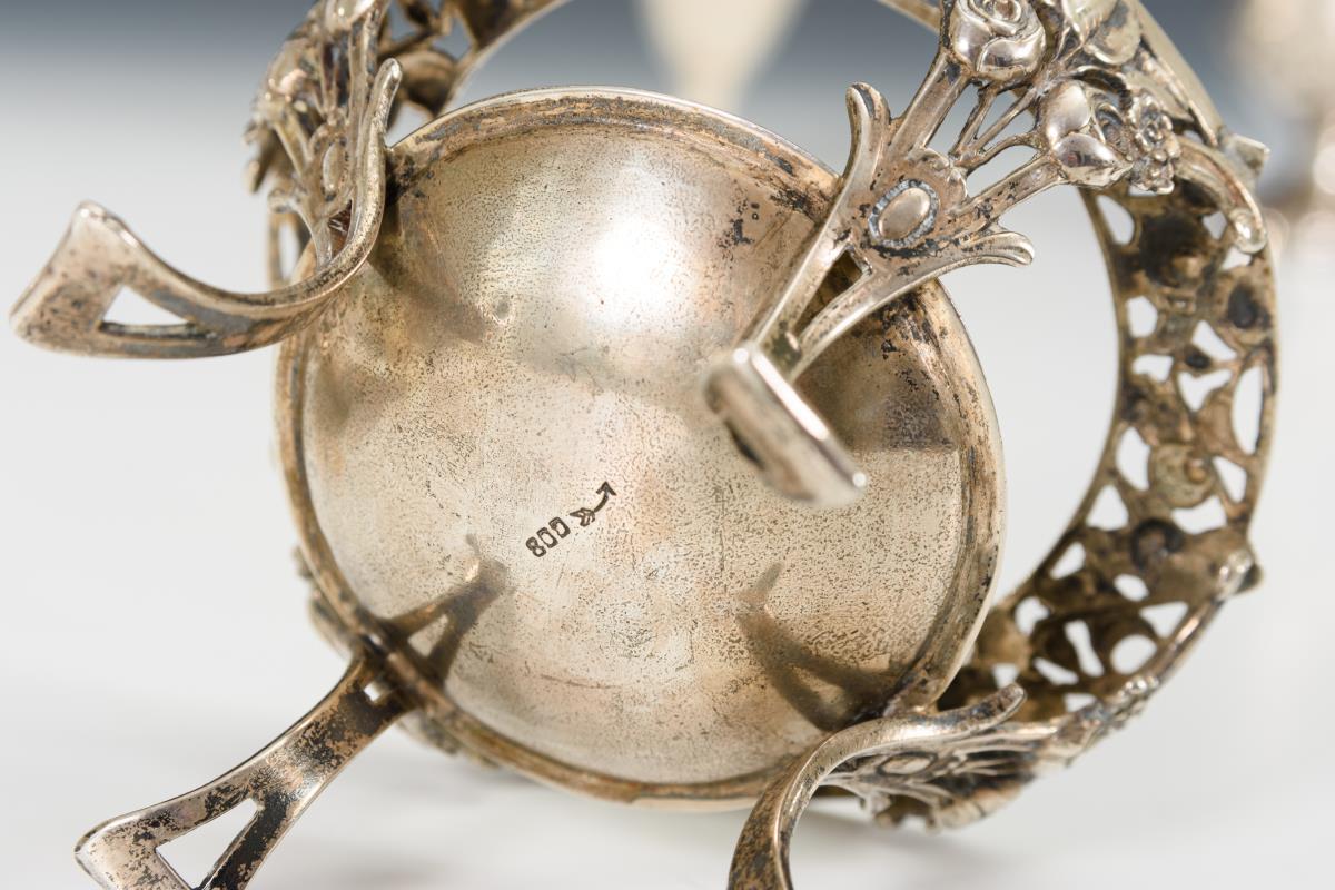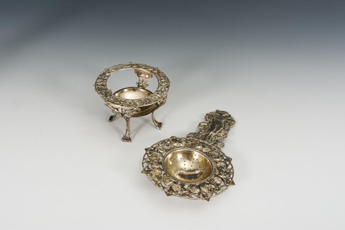 Floral reliefiertes Jugendstil-Teesieb mit figürlichem Griff. / Balusterförmiger Streuer mit Rosenrelief. / Kleiner glatter Streuer. Streuer minimal gedellt.