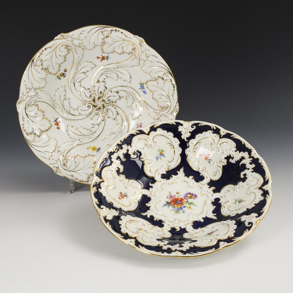 1x mit Rocaillerelief, kobaltblauem Teilfond und Blumenbukett im Spiegel. / 1x mit Akanthusblattrelief und Streublümchenmalerei.