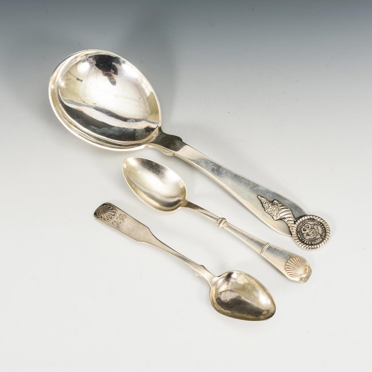 Vorlegelöffel mit Bäcker-Zunftzeichen ("Aarhus Bagerlaug 1934") am Füllhorn. Speiselöffel je mit Jacobsmuscheln, jeweils Monogramm-Gravur, 1x mit Datum 1916. 1x starke Gebrauchsspuren.