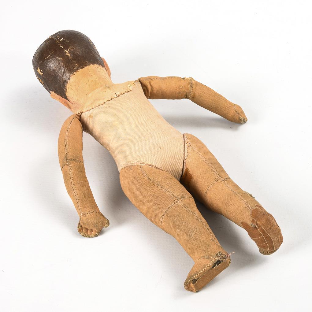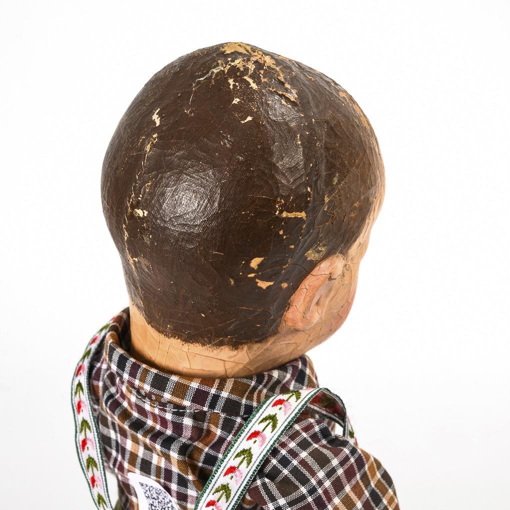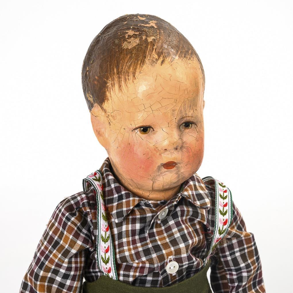 Typ VII. Bemalter Kurbelkopf aus Stoff mit einer Hinterkopfnaht und gemalten braunen Haaren. Schlanker Körper aus verschiedenen Stoffen. Kariertes Hemd, grüne Hose, Pudelmütze, braune Lederstiefel. Gesicht stark krakeliert und retuschiert, Farbdefekte am Hinterkopf, Hände und Füße mit Reparaturen.