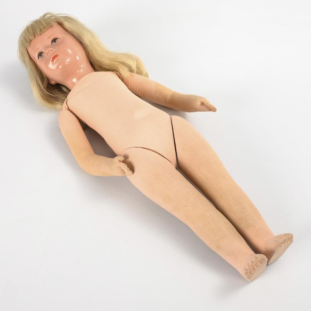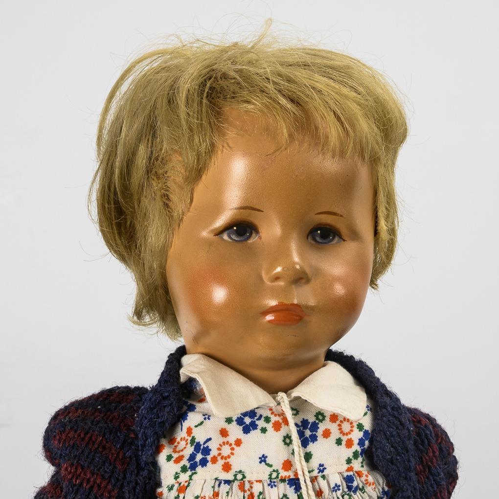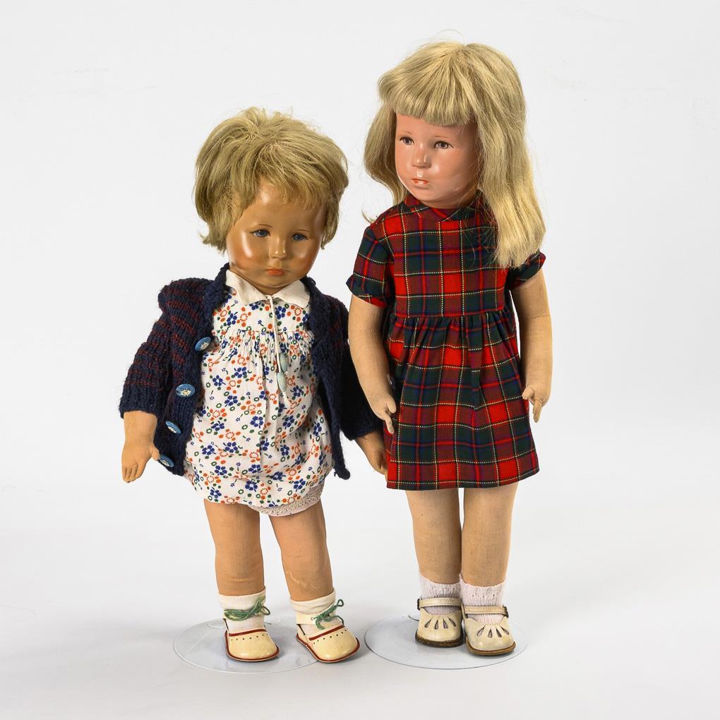 Blondes Puppenmädchen Typ VII mit Tortulonkopf (nicht hautfarben grundiert), Echthaarperücke, schlankem Stoffkörper, kariertem Kleidchen und weißen Lederschuhen, L 52 cm. / Blonder "Hampelschatz" (wohl Typ XII BH) mit Kunststoffkopf, Echthaarperücke und Hampelchen-Körper (ohne Knopf und Bändchen im Rücken). Geblümtes Kleid, dunkelblaue Strickjacke, L 45 cm. Beide am Körper fleckig, 1x Gesichtsbemalung berieben.