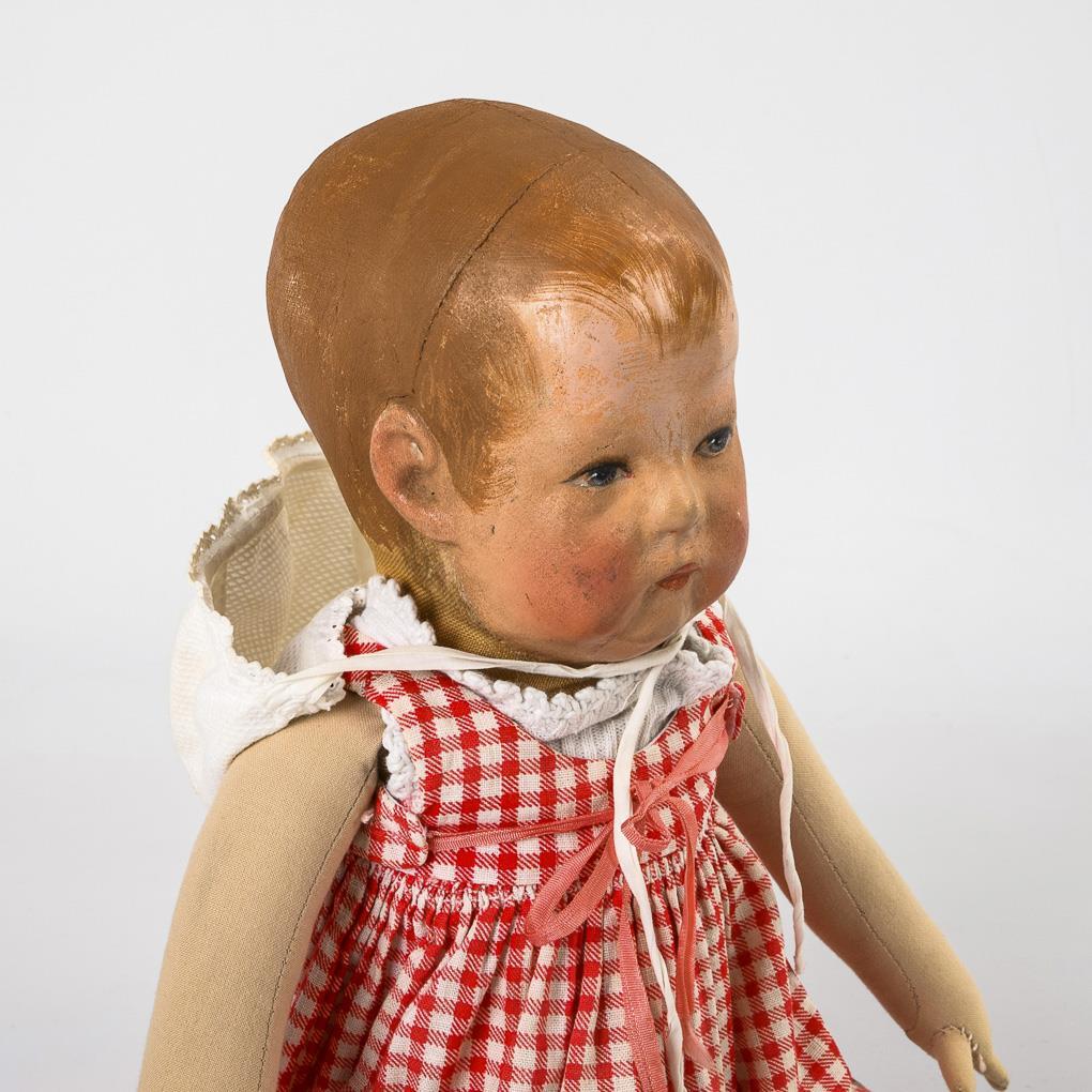 Typ I. Maskenartig bemalter Kopf mit 3 Hinterkopf- und 2 Kinn-Nähten. Körper mit breiten Hüften und 5 Nähten an den Beinen (aus sehr hellem Stoff, eventuell jünger in der Manufaktur ergänzt?). Rot-weiß kariertes Kleid, weiße Haube. Kopf mit Retuschen.