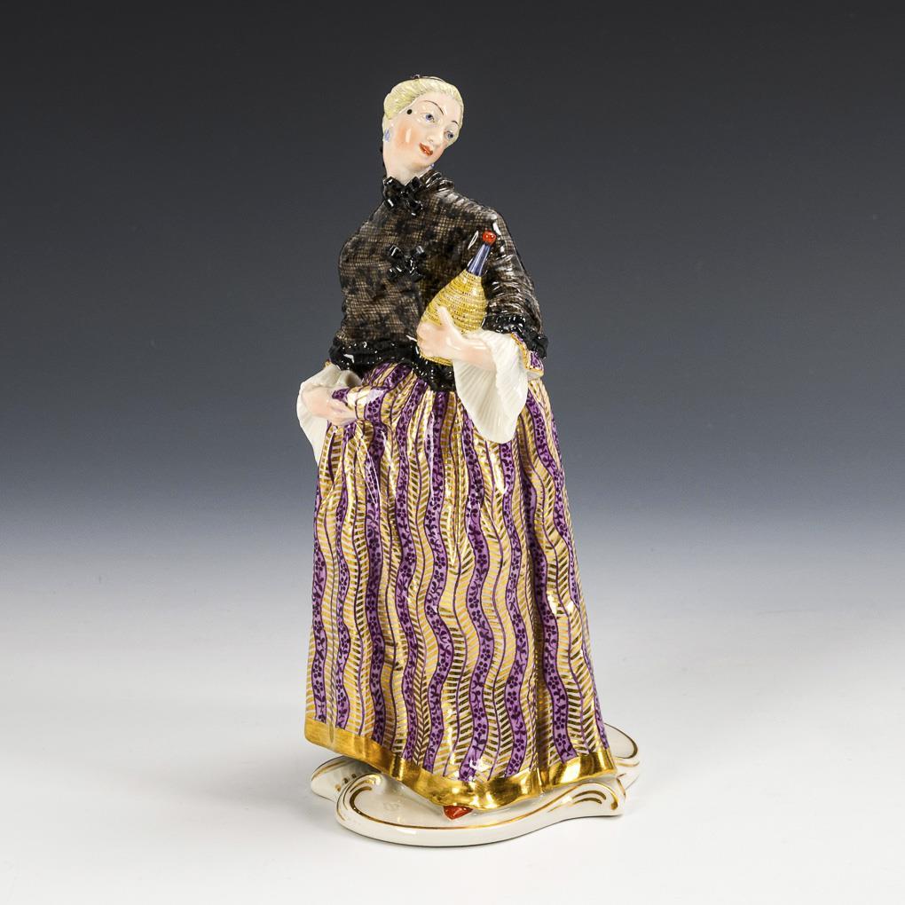 Auf einem Rocaillesockel stehende Dame mit Korbflasche. Haarfeder fehlt.