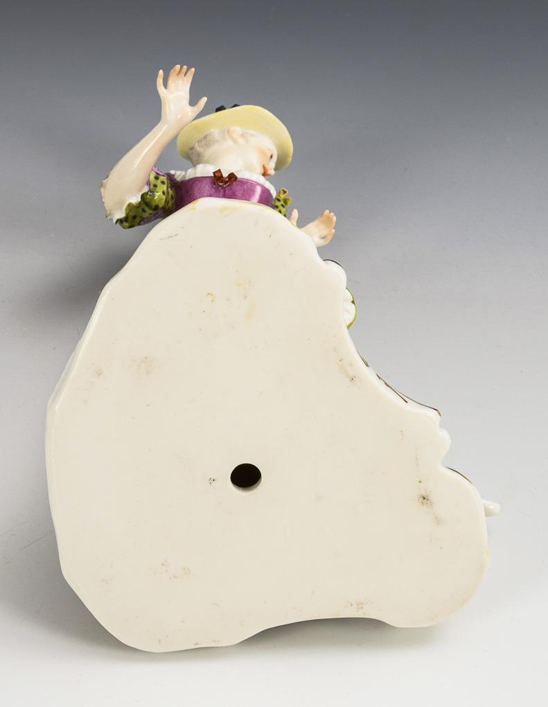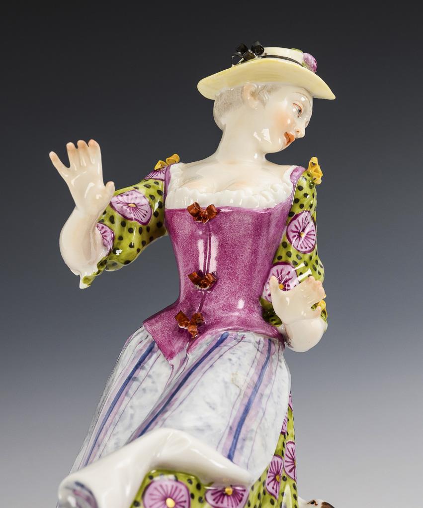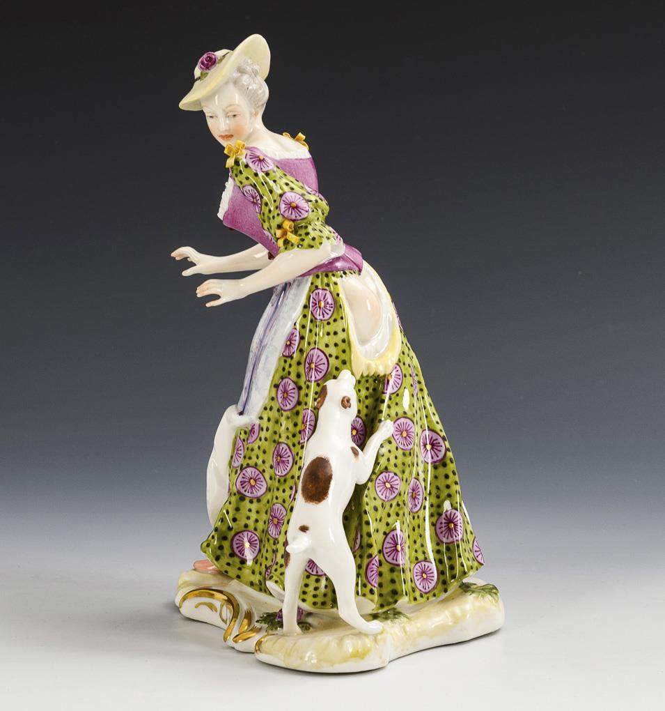 Auf einem Rocaillesockel stehende Dame, sich nach einem ihr Kleid zerreißenden Hund umschauend. 1 Schleife bestoßen.