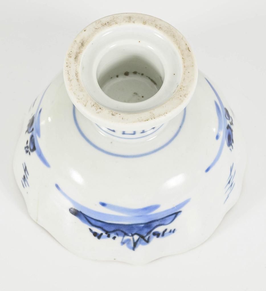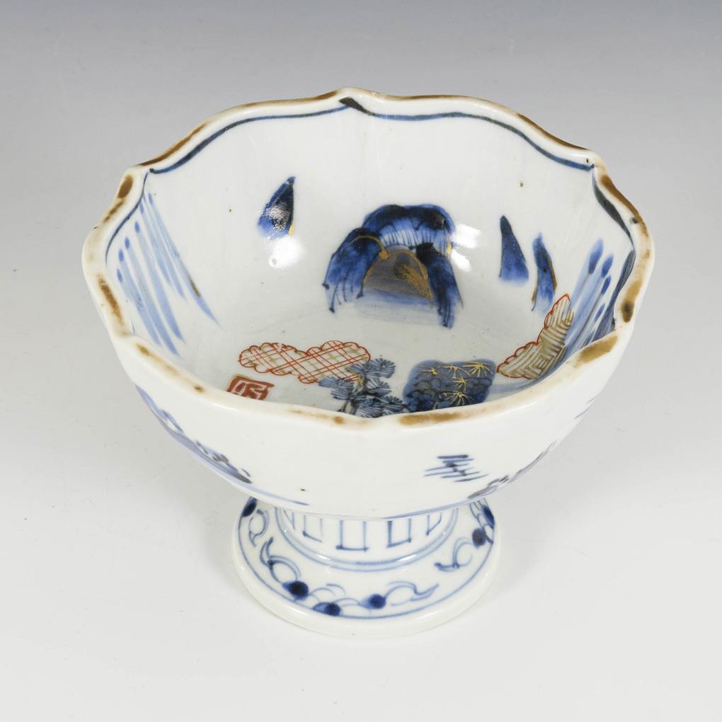 Hoher Fuß mit kleiner, gewellter Schale. Gemarkt mit "Hi" Zeichen für die Provinz Hizen. Landschaft in Unterglasurblaumalerei mit Rot und Goldfarbe. Randvergoldung stark berieben.