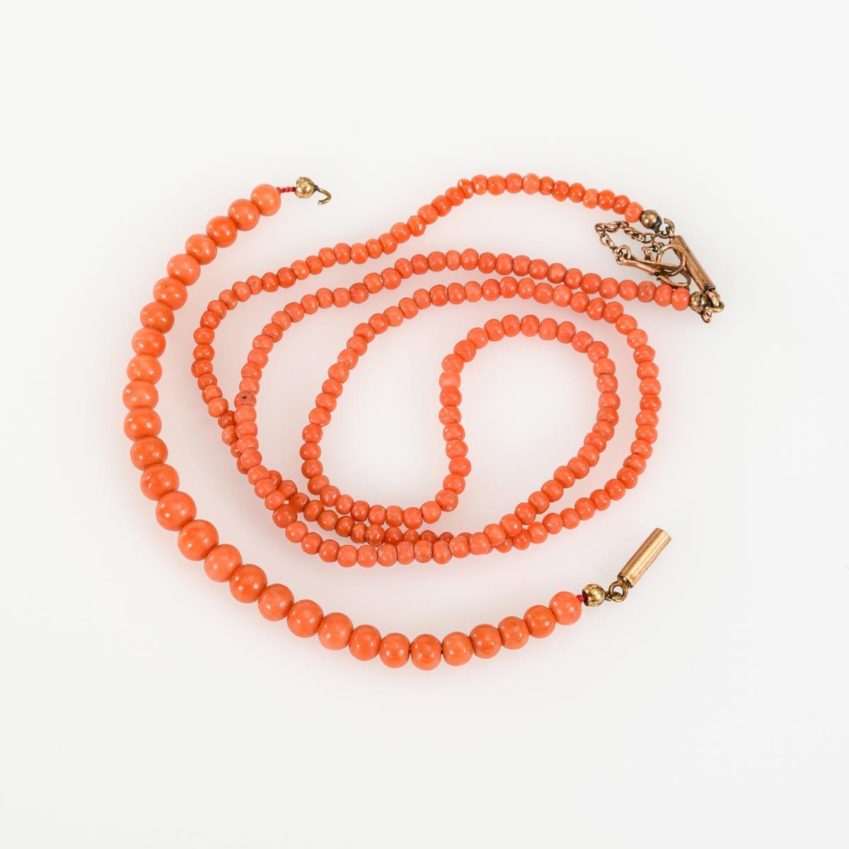 Schnürketten mit Korallenkugeln an Hülsenschloss mit Sicherheitskette. Armbandschloss defekt.