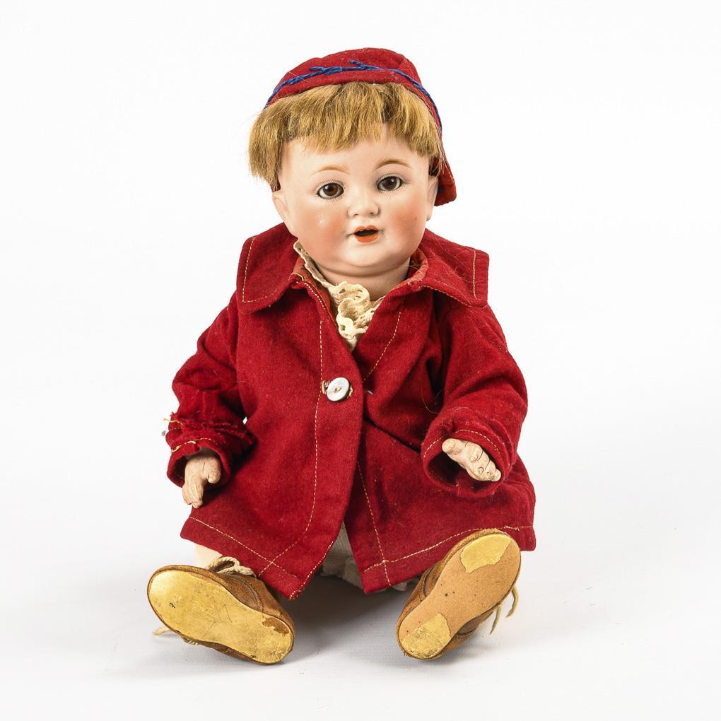 Kurbelkopf, braune Schlafaugen, blonde Echthaarperücke. 5-teiliger Sitzbabykörper. Weinroter Mantel, passendes Häubchen, braune Lederschuhe. Kopf durchleuchtet: ohne Defekte.