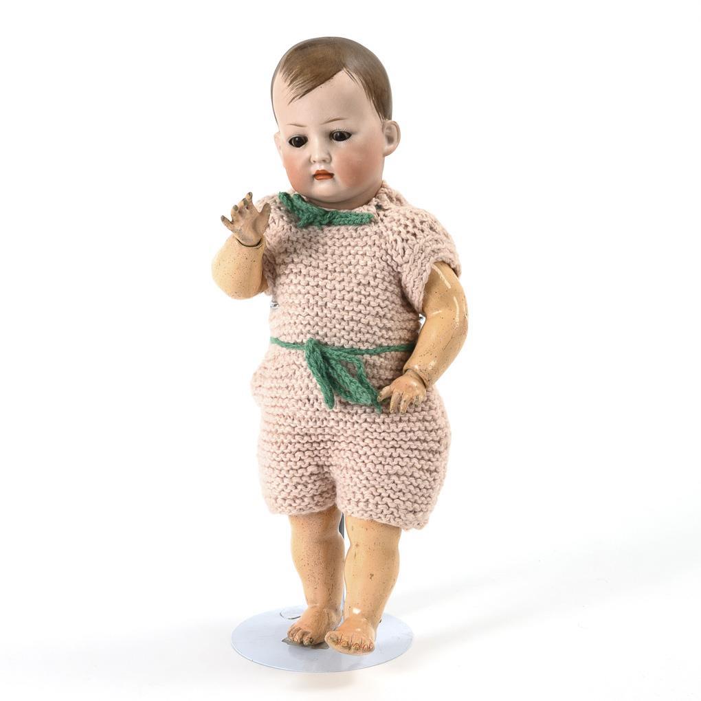 Vollkopfjunge mit Kindergesicht. Kurbelkopf, braune Schlafaugen, gemalte braune Haare. 7-teiliger Stehpuppenkörper mit beweglichen Händen. Rosa Strickkleidung. Kleine Chips am rechten unteren Augenlid. Linkes Bein mit 2 kleinen Defekten am Oberschenkel.