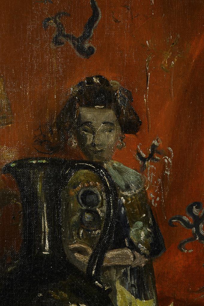 Messinggefäß neben Glaskaraffe und asiatischer Figur vor rotem Vorhang. Altersspuren.