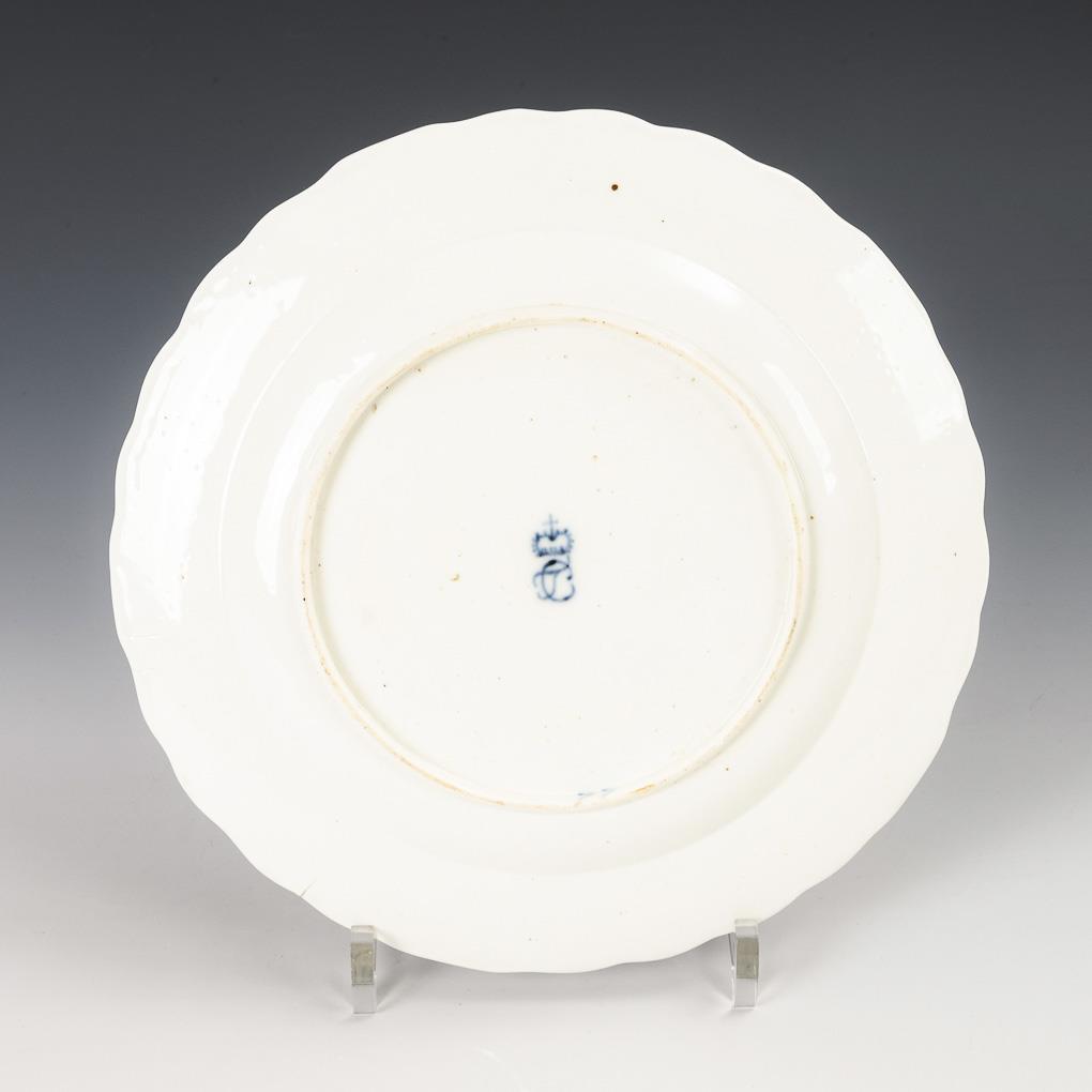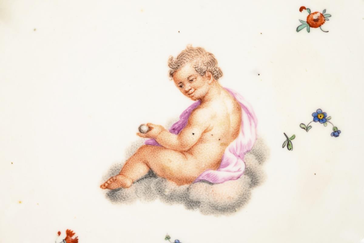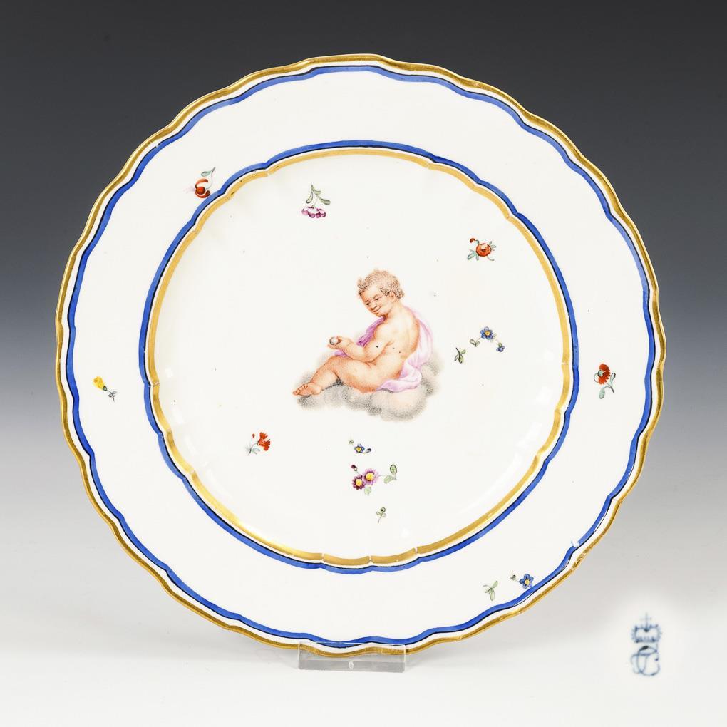 Speiseteller mit passigem Rand, im Spiegel die Darstellung eines auf einer Wolke sitzenden, von Streublümchen umgebenen Putto mit Kugel. 2 kleine Brandrisse am Rand.