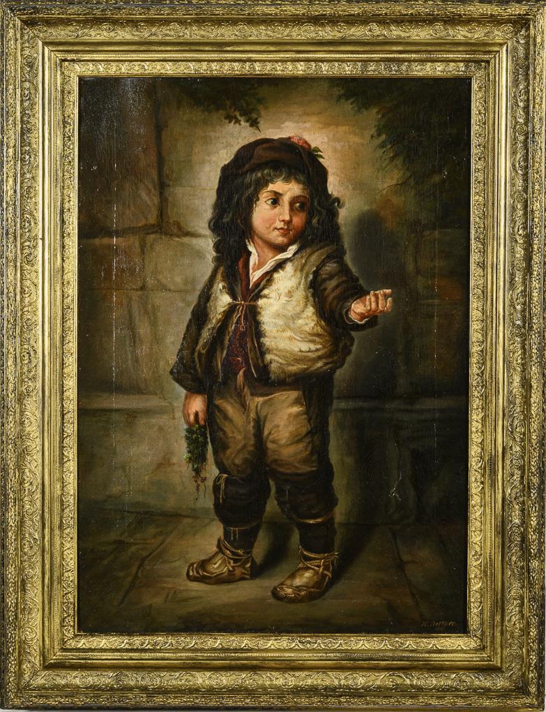 Kleiner Betteljunge in ärmlicher Kleidung, mit ein paar Blumen in der Hand, an einer Mauer. Minimale Altersspuren.