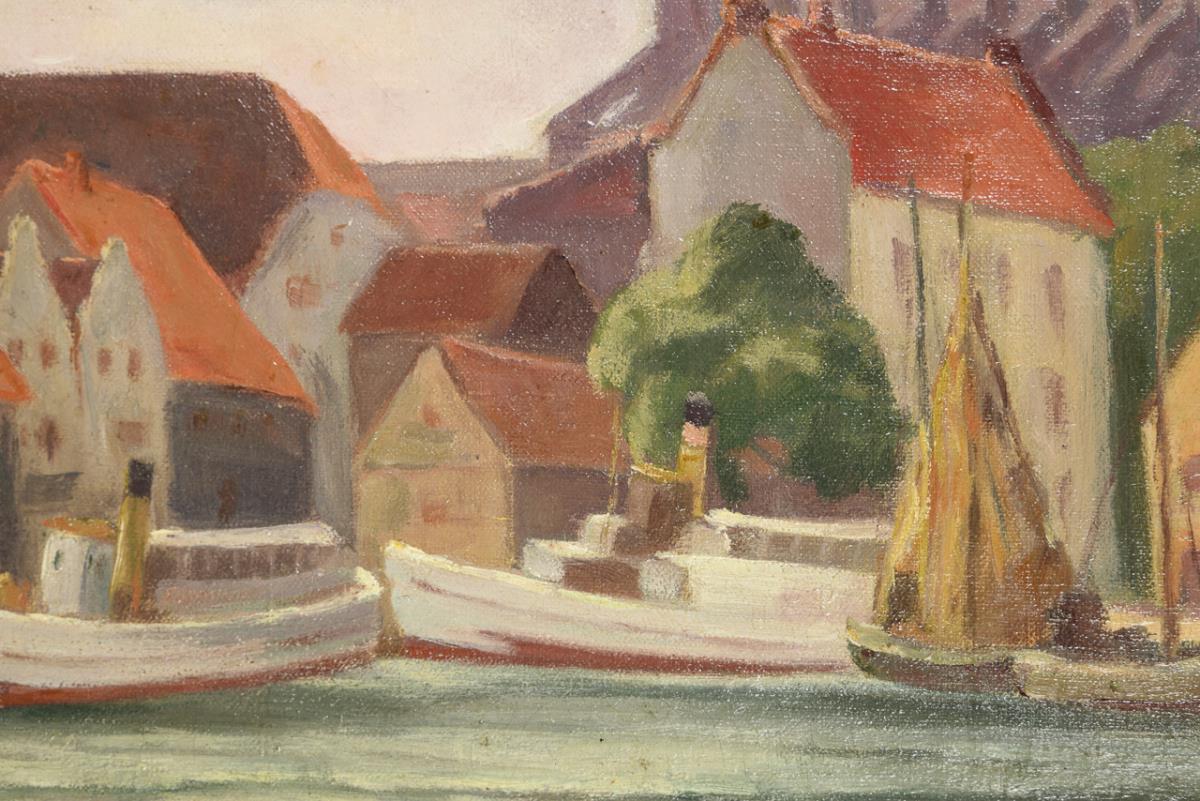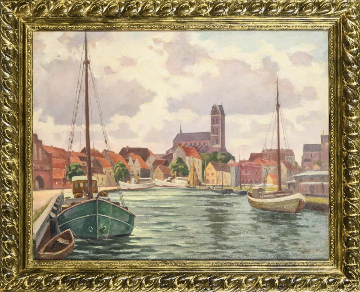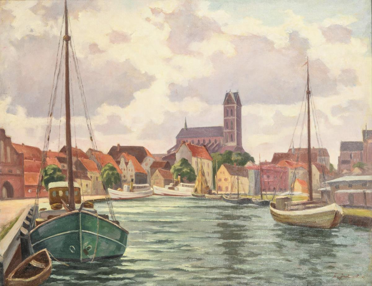 Schiffe im Hafen vor den Stadthäusern und der Marienkirche unter wolkigem Himmel.