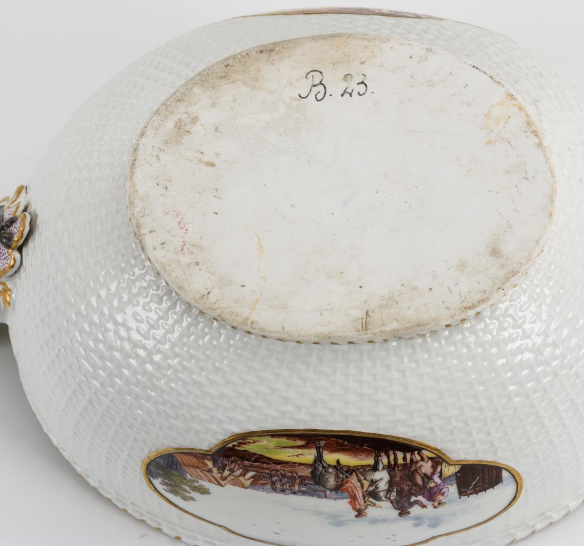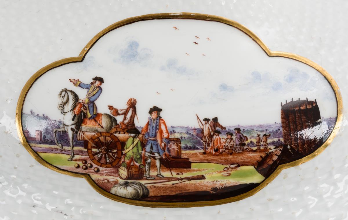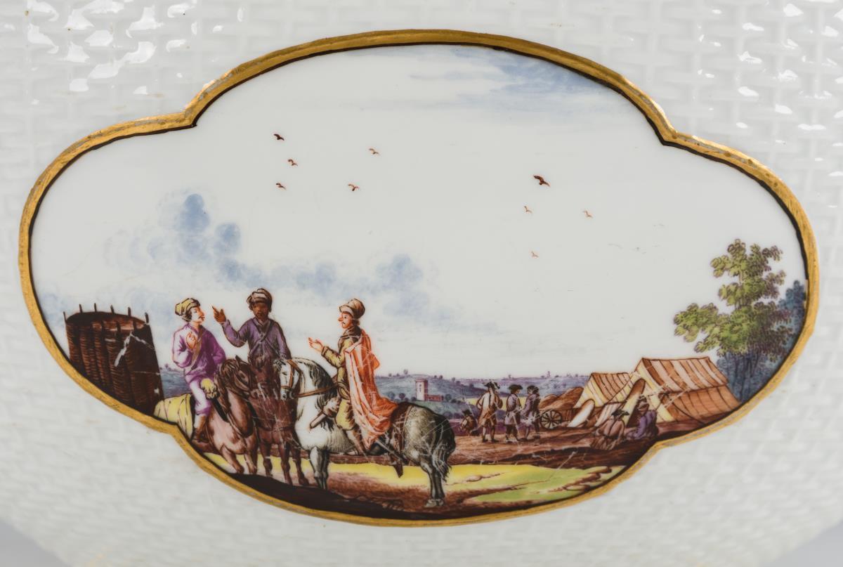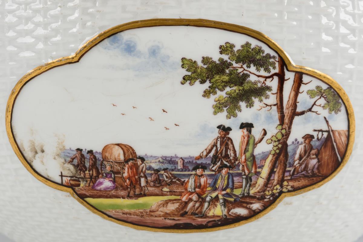 Ovale Terrine mit Korbstruktur, zwei Maskaronhandhaben und Knaufdeckel. In vier Vierpasskartuschen verschiedene Szenen aus einem Militärlager. Partieller Goldabrieb, partiell Kratzspuren auf der Malerei, kleiner Brandriss an 1 Handhabe sowie 3 kleine Brandriss im Spiegel, Handhaben minimal berieben.