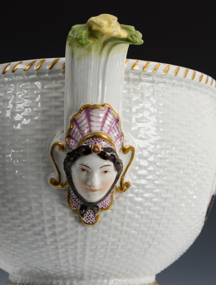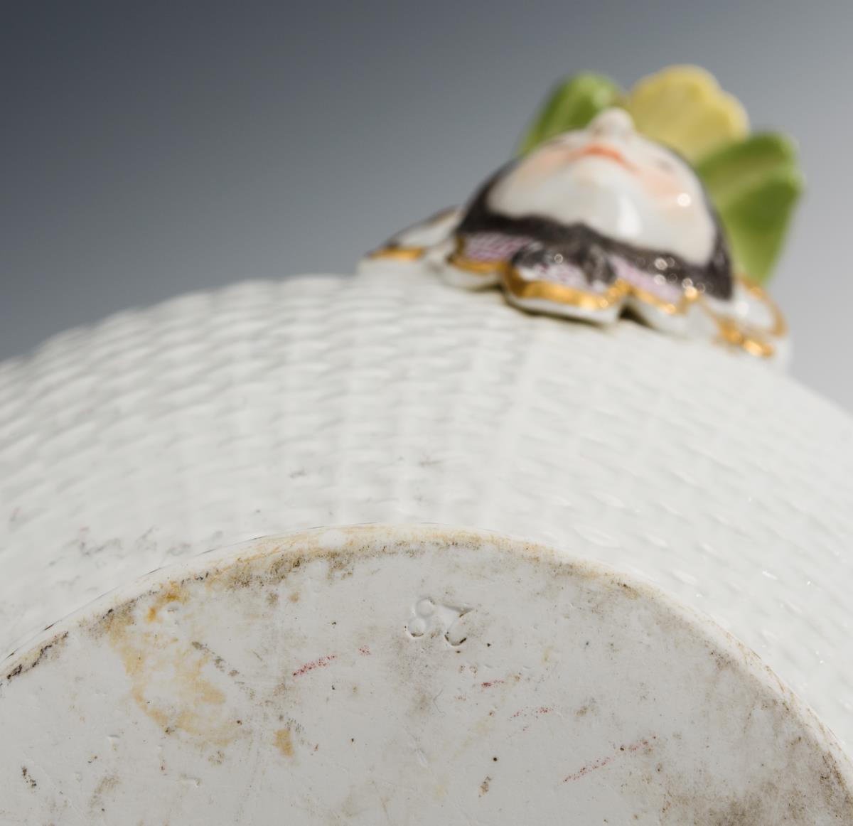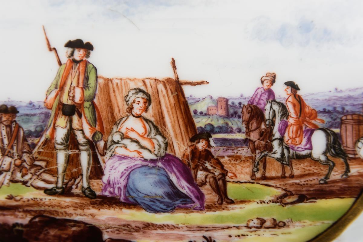 Ovale Terrine mit Korbstruktur, zwei Maskaronhandhaben und Knaufdeckel. In vier Vierpasskartuschen verschiedene Szenen aus einem Militärlager. Partieller Goldabrieb, partiell Kratzspuren auf der Malerei, kleiner Brandriss an 1 Handhabe sowie 3 kleine Brandriss im Spiegel, Handhaben minimal berieben.