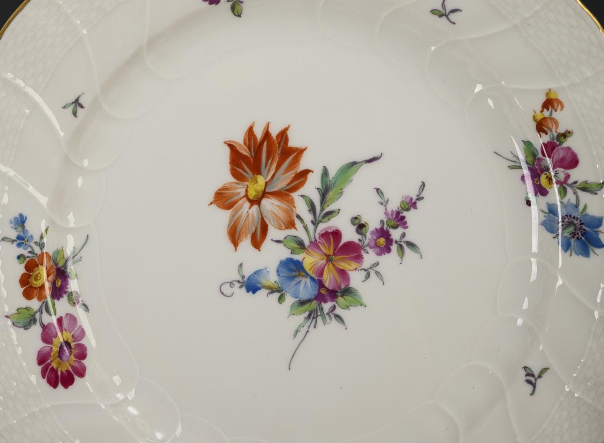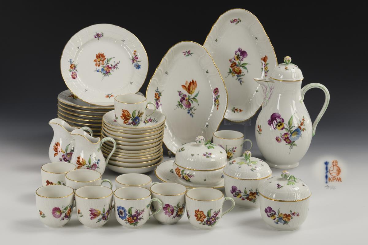 42 Teile. Modell "Neuozier". Kaffeekanne (H 24,5 cm), 2 Milchkännchen, 2 Zuckerdosen, 10 Tassen, 12 Untertassen, 12 Frühstücksteller, 2 Ovalschalen (L 26 cm) und 1 Butterdose (Ø 19 cm).