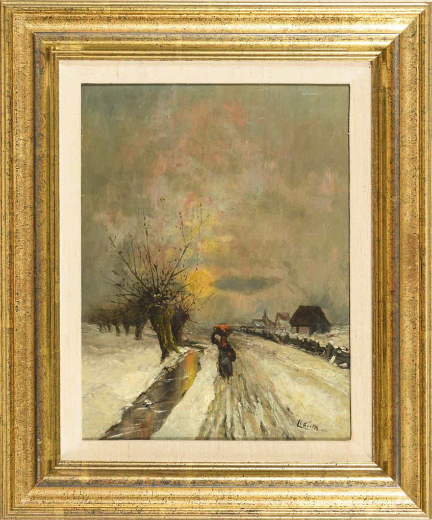 Frau mit Korb auf verschneiter Straße bei tief stehender Sonne nahe einem Ort.