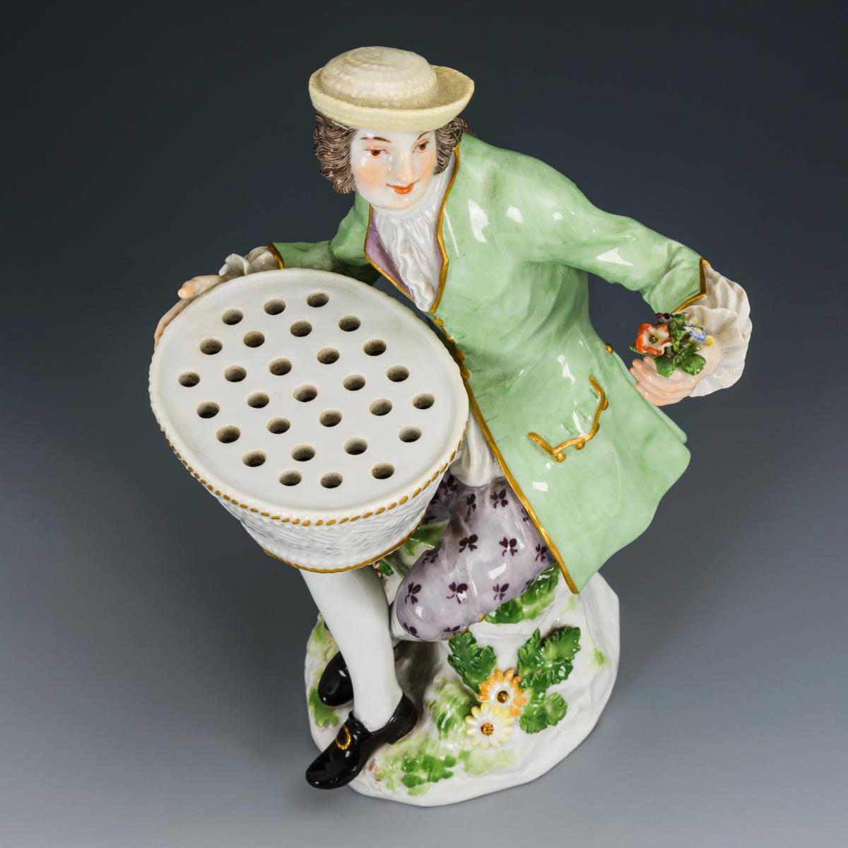 Auf einem Felssockel sitzender Gärtner, einen Korb mit durchbrochenem Deckel tragend. Schuhe restauriert, Blumensträußchen etwas bestoßen.