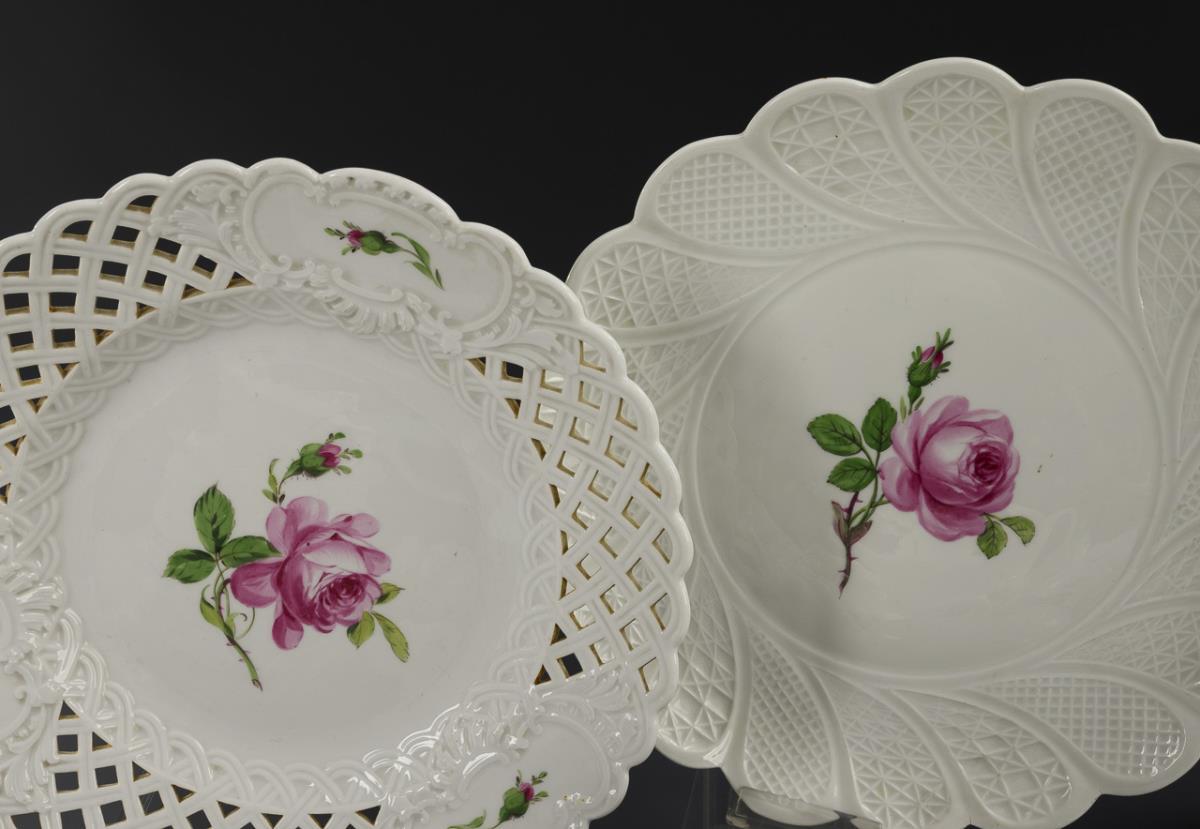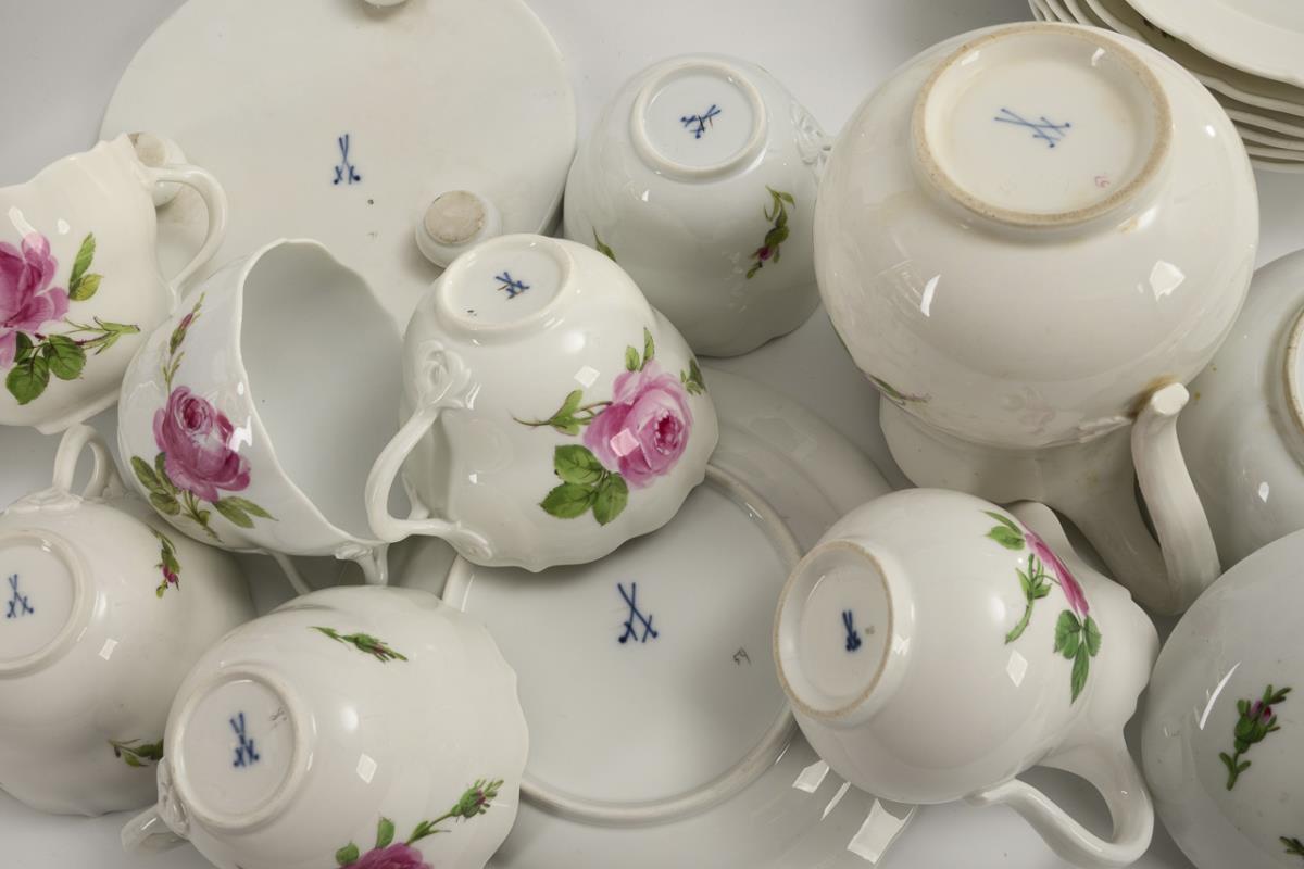 40 Teile. Form "Neuer Ausschnitt". 2 Teekannen (H 11,5 und 13 cm), 2 Kaffeekannen (H 21 und 24,5 cm), 2 Milchkännchen (H 9 und 13,5 cm), Zuckerdose, 7 Kaffeetassen, 15 Untertassen, 8 Kuchenteller, 1 Durchbruchteller (Ø 28,5 cm), 1 Fächerplatte (Ø 28,5 cm) und 1 Untersetzer. Rosenknäufe bestoßen, 1 Deckelnase fehlt, minimale Bestoßung an der Schneppe einer Kaffeekanne, Bestoßung am Deckelrand der Zuckerdose und an 1 Untertassenrand.
