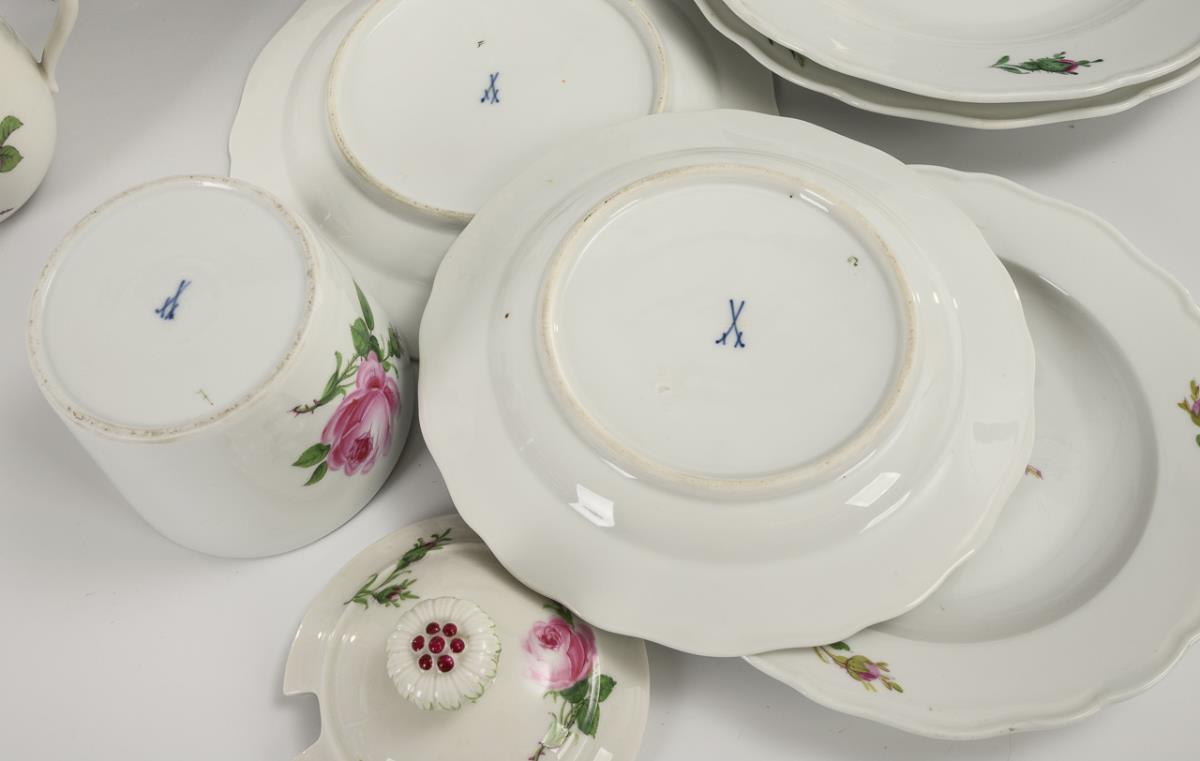 Verschiedene Formen. Kratervase (H 13,5 cm), Kännchen (H 13,5 cm), Zuckerdose (H 13,5 cm), 5 Teller (Ø 2x 24,5 cm, 2x 19,5 cm und 1x 21,5 cm), 1 ovales Tablett (L 27,5 cm) und 1 Reliefschale (Ø 23,5 cm). Rosenknauf des Kännchendeckels bestoßen.