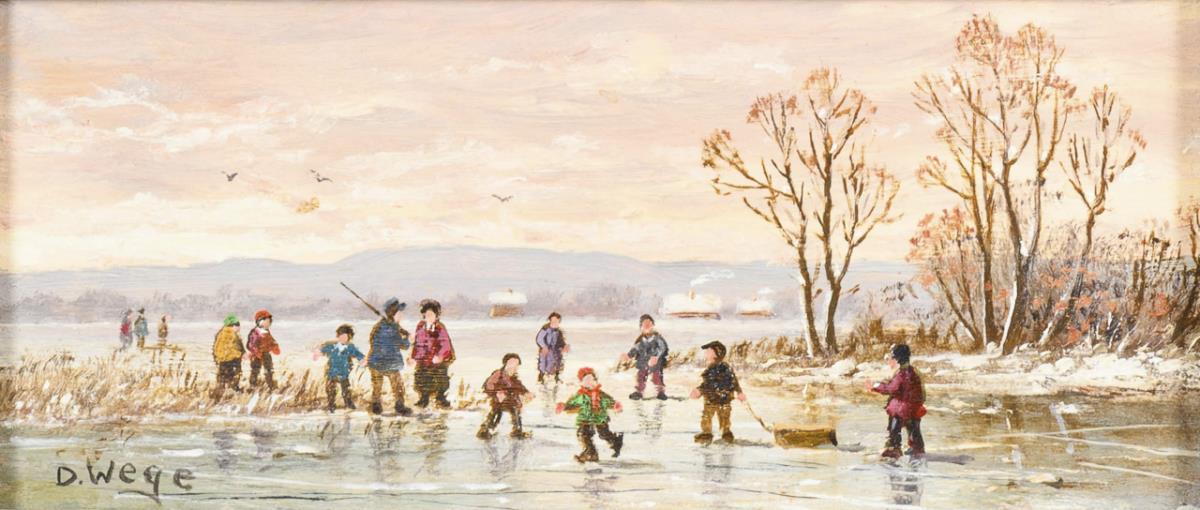 Viele Kinder auf dem gefrorenen See an einem hellen Wintertag.