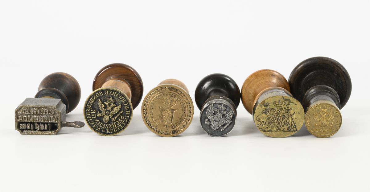 Verschiedene Hölzer, Typare aus Messing bzw. Eisen. L maximal 10,5 cm.