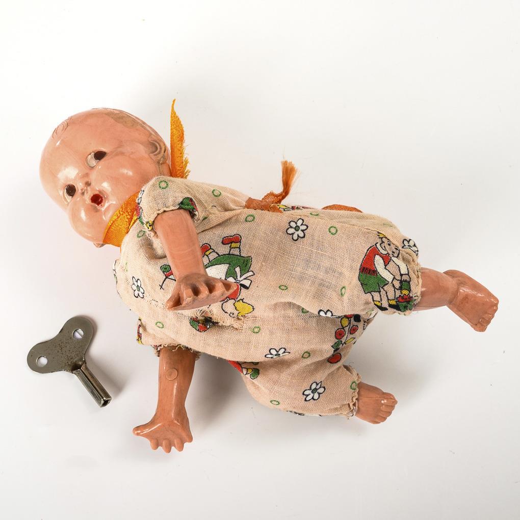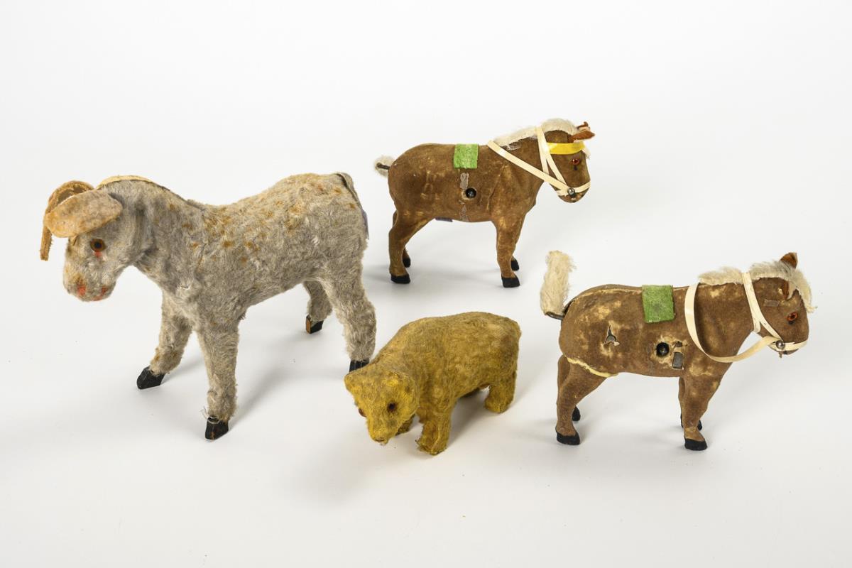 Krabbelndes Celluloid-Baby mit intaktem Werk und Schlüssel. H 12 cm. / 2 mechanische Pferdchen, die den Schweif drehen. Werke intakt. H je 10,5 cm. / Grauer Esel (H 13 cm) und weißer Bär (H 6 cm), jeweils mit Kunstplüschbezug. Altersspuren, kleine Defekte.