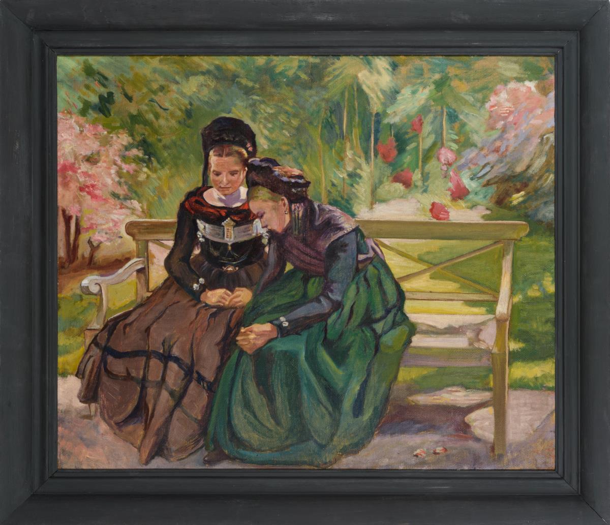 Wohl skizzenhafte Variante des Bildes "Im Schatten der Liebe" (1904), auf dem Ella und Regina Olufs dargestellt sind und welches sich in norddeutschem Privatbesitz befindet.