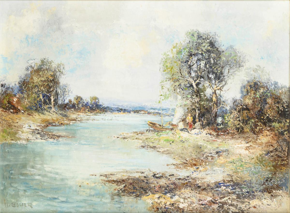 Seichter Flusslauf mit angrenzenden Baumgruppen und Büschen und Staffagefiguren.