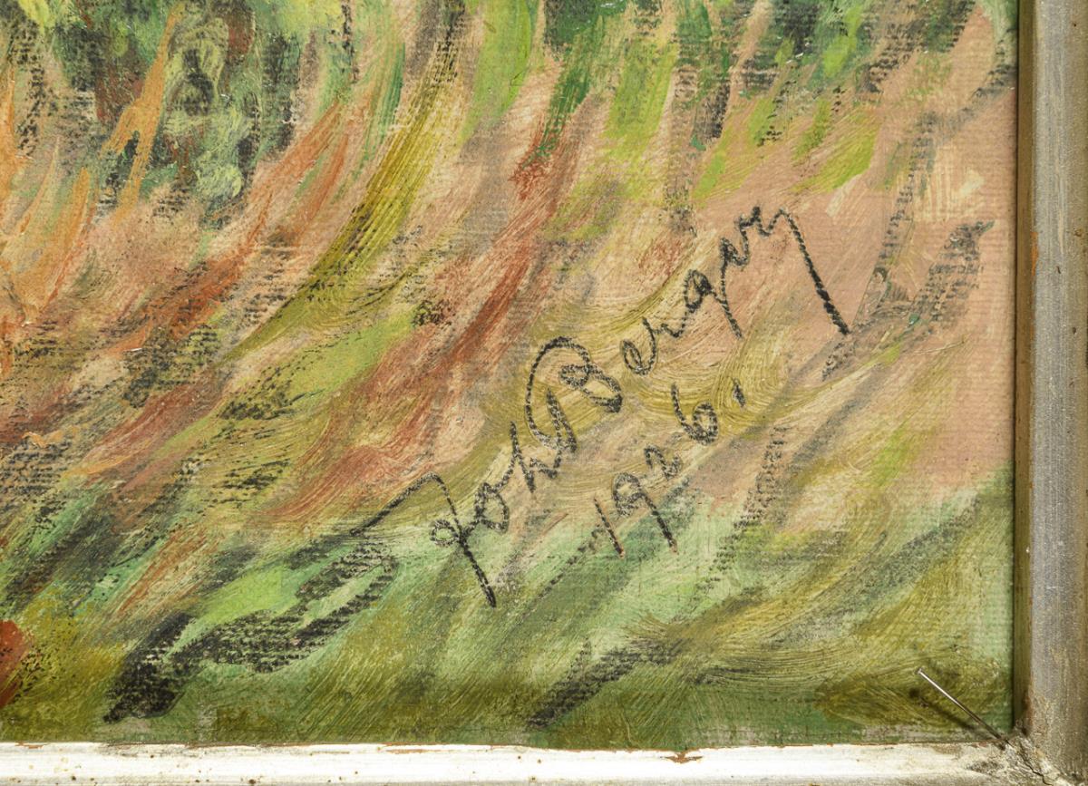 Öl/Leinwand. Rechts unten signiert, verso auf altem Klebezettel wohl vom Maler bezeichnet/betitelt mit Adresse in Dresden sowie Rest wohl eines Ausstellungs-Etikettes. 1926.