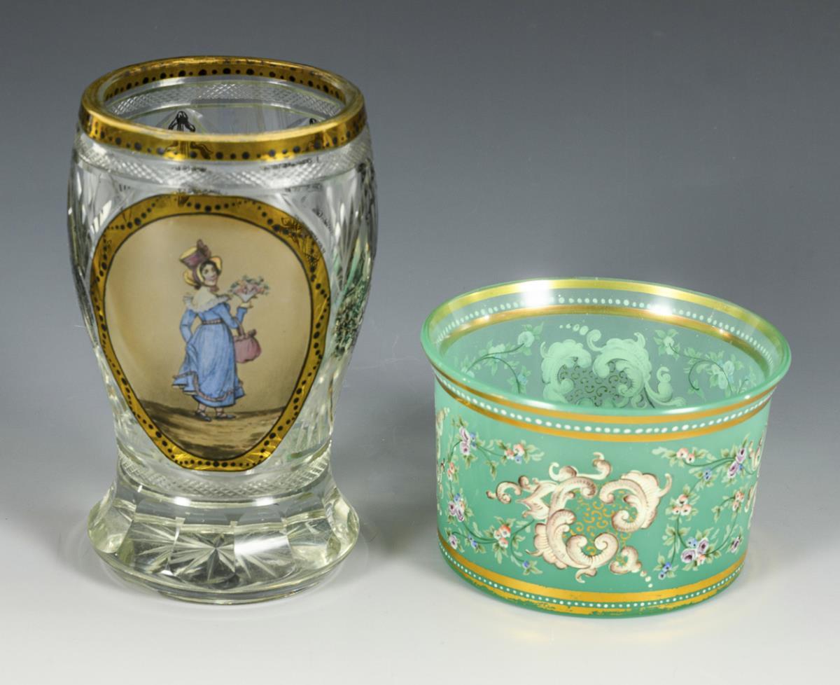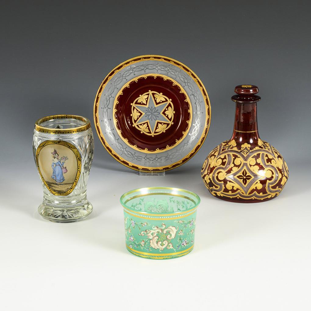 1x gedrückt gebauchte Karaffe aus farblosem, rot gebeiztem Glas, mit Stopfen und reicher, ornamentaler Malerei in Beige und Gold (H 17 cm). / Passend ergänzter Unterteller mit beige-goldener, ornamentaler Malerei (Ø 19,5 cm). / 1x Ranftbecher aus farblosem Glas: schauseitig ein Ovalmedaillon mit der emailgemalten Darstellung einer Biedermeier-Dame, goldstaffiert (H 15 cm). / 1x Zylinderschale aus grünem Uranglas mit ornamentaler Emailmalerei, goldstaffiert (H 7 cm). Partiell Gold etwas berieben, minimale Bestoßungen am Rand des Ranftbechers.