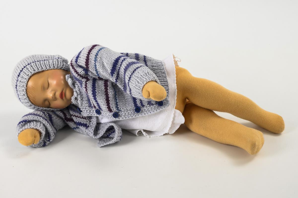 Typ Vs, beschwerte Ausführung. Schlafendes Baby mit Kunststoff-Kopf, Stoffkörper ohne Nabel und Poloch. Weißes Baby-Hemdchen, gestreifte Strickjacke. Nasenspitze und Kopf berieben.