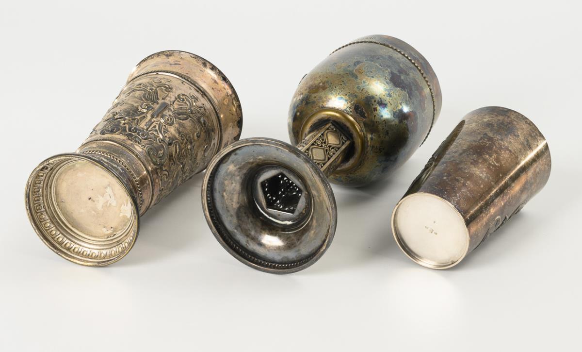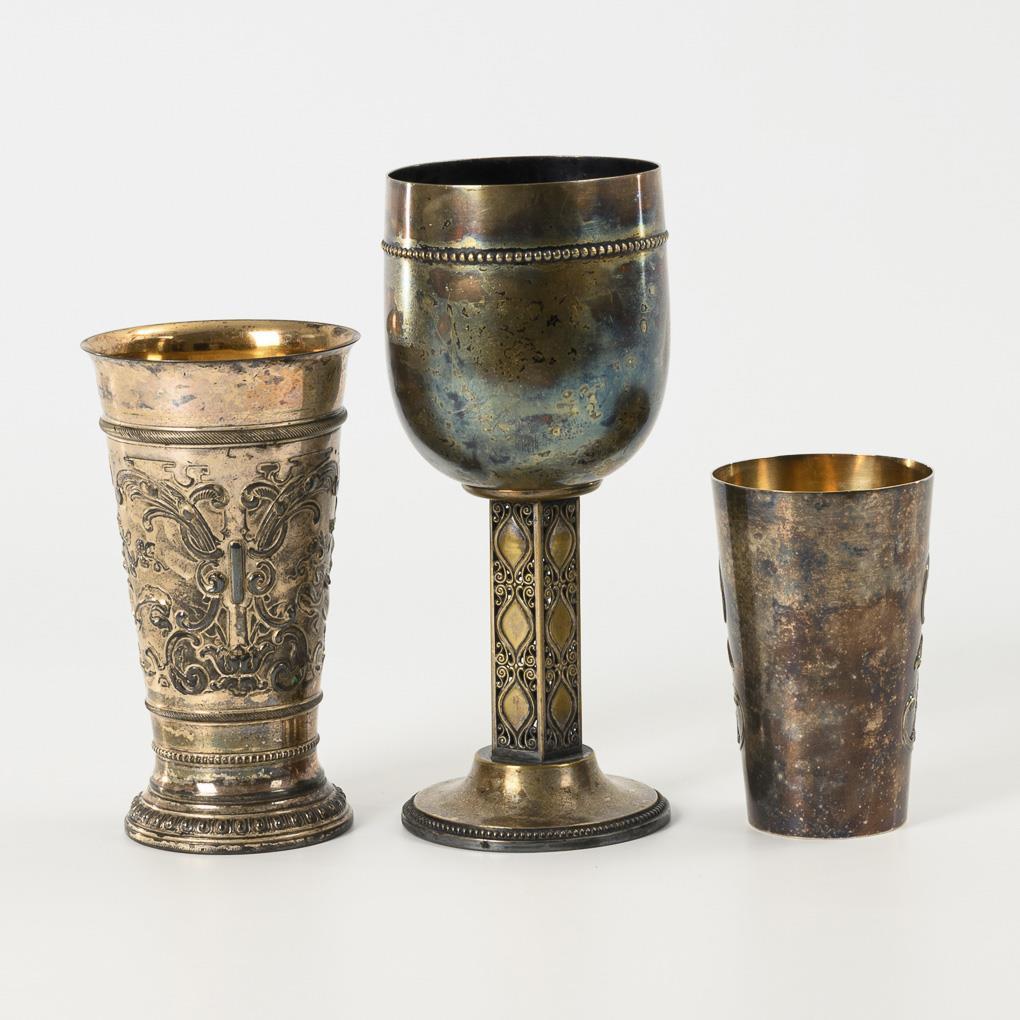 Art-déco-Pokal mit 5-seitigem, durchbrochen ornamentiertem Schaft; auf der Wandung Email-Wappenapplik "Wien", an der Lippe gravierte Widmung mit Datum 1930. / Jugendstil-Becher mit umlaufend reicher Reliefzier, darunter eine leere Wappenkartusche mit Begleitfigur, an der Lippe Gravur: "Dem Ritterkönig Querfurt 1900". / Becher mit Gravur "Ehrenpreis z. p. h. Prüfung (19)14" in der Wappen-Reliefkartusche. Pokal stark berieben, sonst kaum, teils geschwärzt.