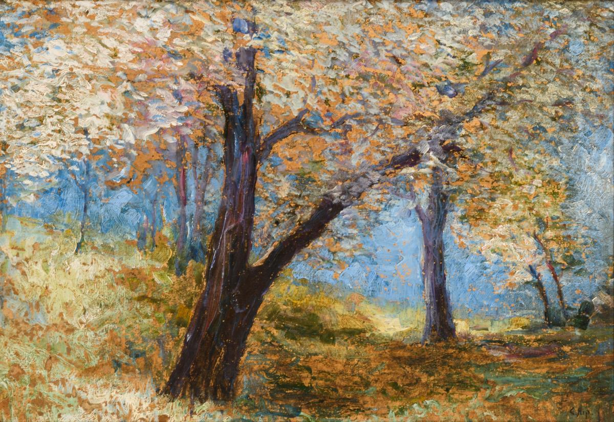 Impressionistisch gemalte Obstbäume mit dichtem Blütenkleid unter blauem Himmel.