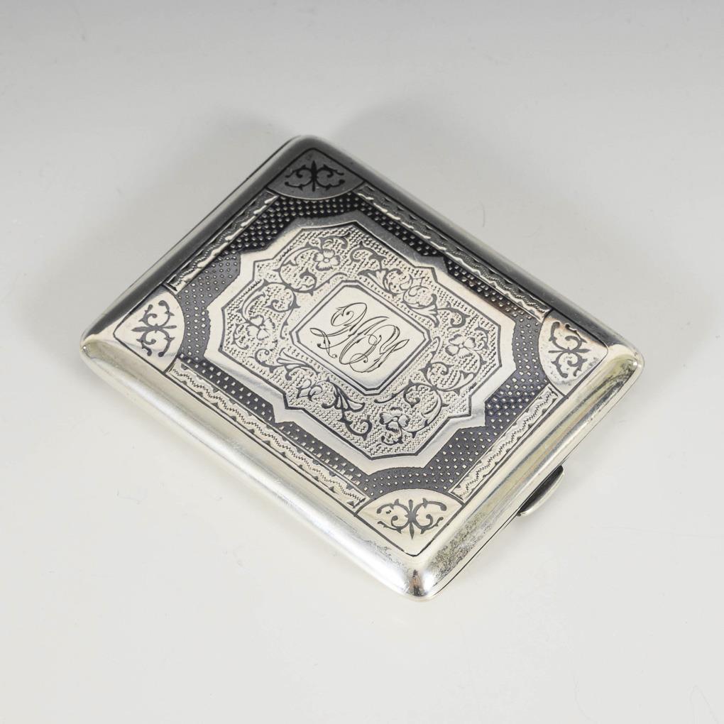 In Niello-Technik verziertes Etui mit verschlungener, kyrillischer? Monogrammgravur. Kratzer innen.