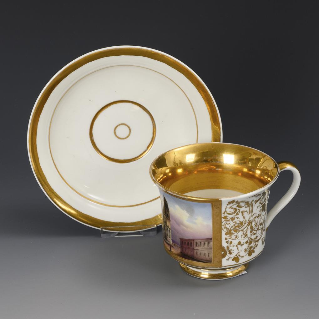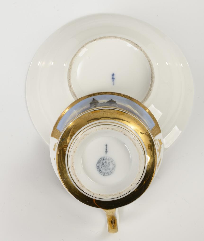 Polychrom bemalt, goldstaffiert. Tasse (H 7,5 cm), ergänzte Untertasse (Ø 14,5 cm).