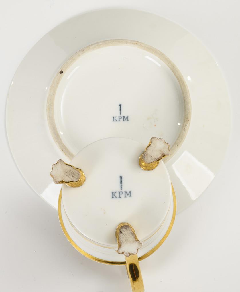 Polychrom bemalt, goldstaffiert. Tasse (H 13 cm), originale Untertasse (Ø 18,5 cm).