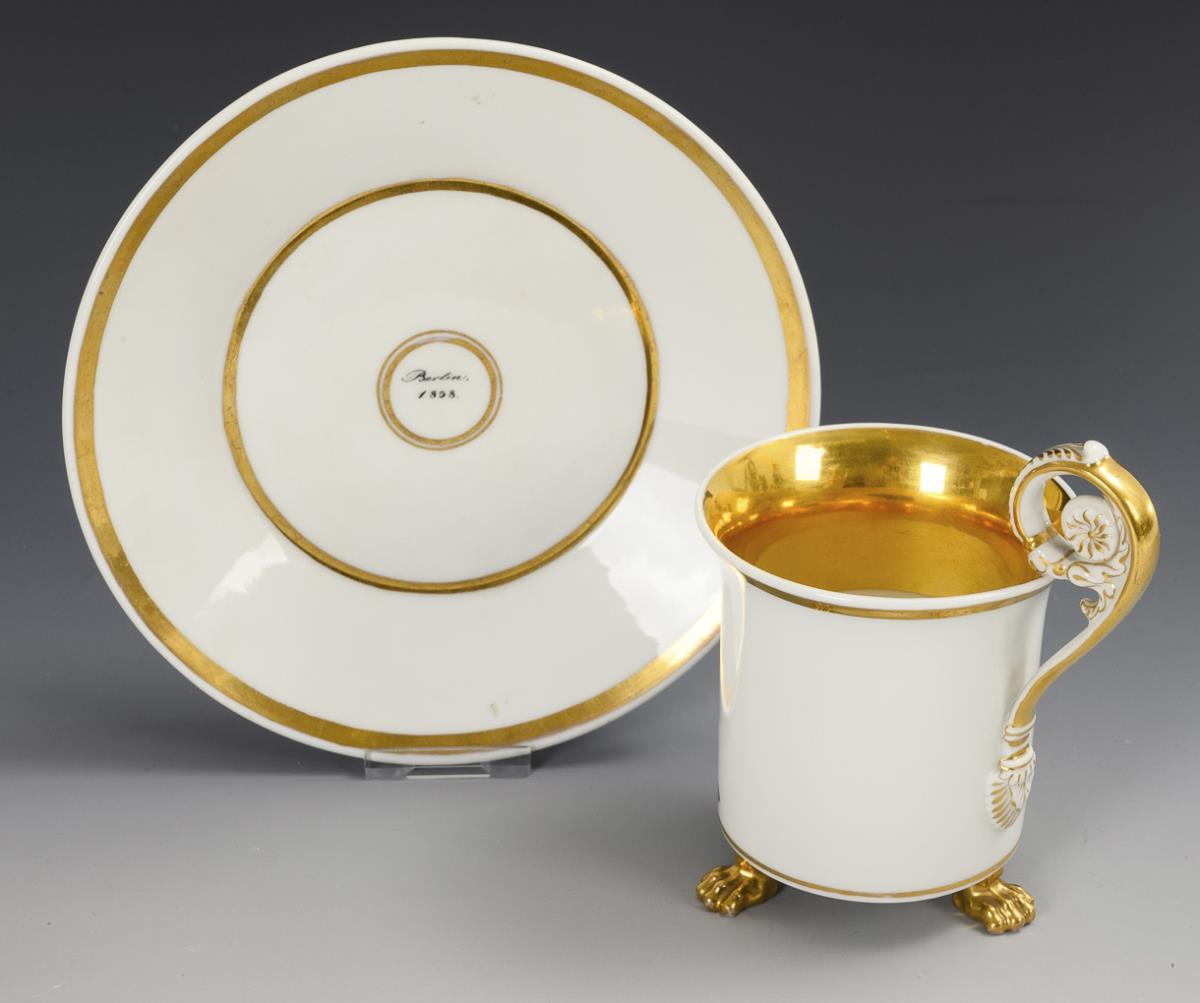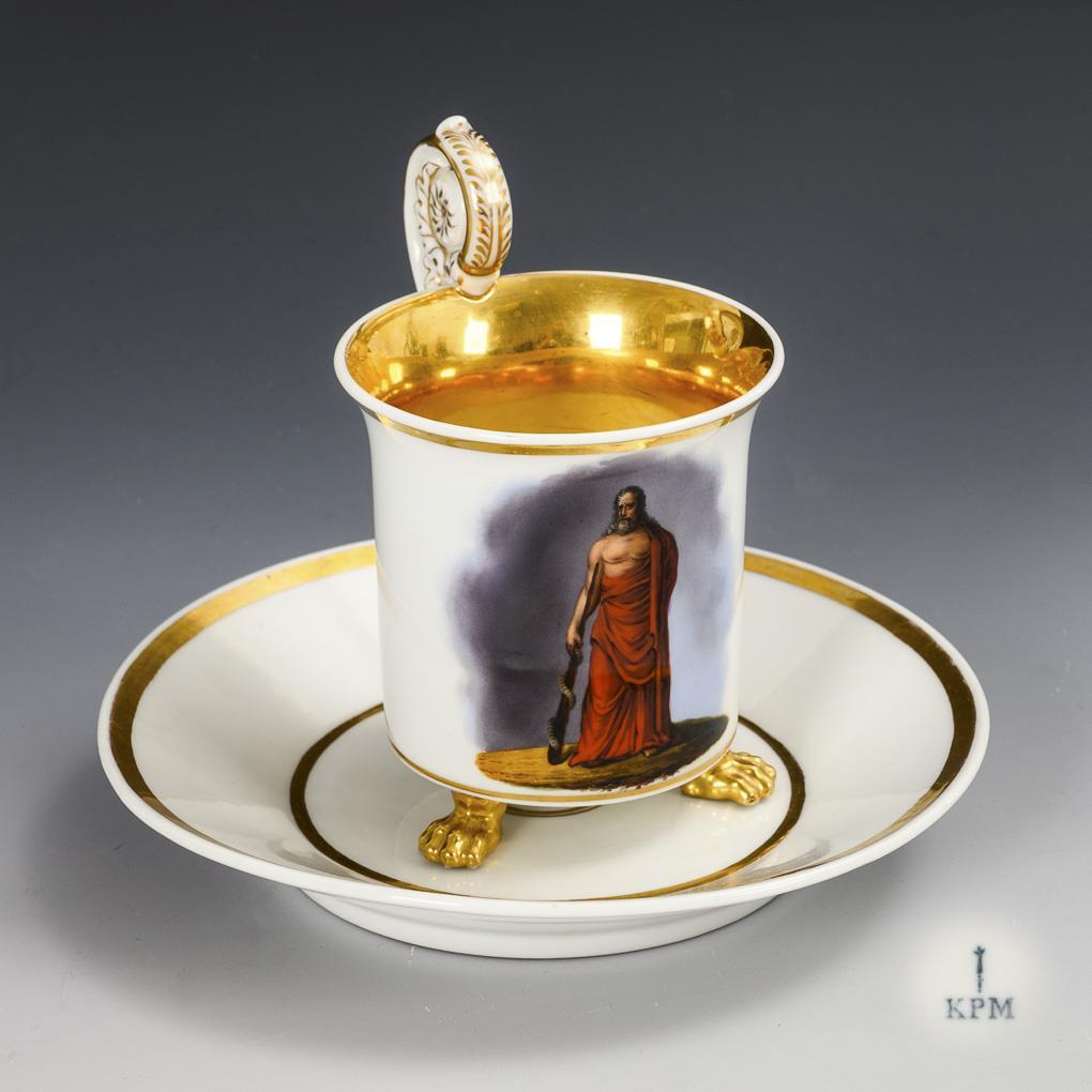Zylindertasse mit Kraterrand, drei Tatzenfüßen und Rosettenhenkel. Schauseitig die Darstellung des Gottes der Heilkunde mit Schlange und Stab, im Spiegel der originalen Untertasse die Datierung "Berlin 1838.".